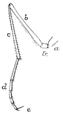 Turning again to the "feet" of the caterpillar, it will be seen [Pg 4]from the figure that the true legs (a) differ from the false legs (b) in structure. The former are horny, jointed, and have terminal claws; the latter are fleshy, with sliding joints, and the foot is furnished with a series of minute hooks which enable the caterpillar to obtain a secure hold when feeding, etc. The false legs are also the chief means of locomotion, as the true legs are of little service for this purpose. The true legs, however, appear to be of use when the caterpillar is feeding, as the leaf is held between them so as to keep it steady whilst the jaws are doing their work.