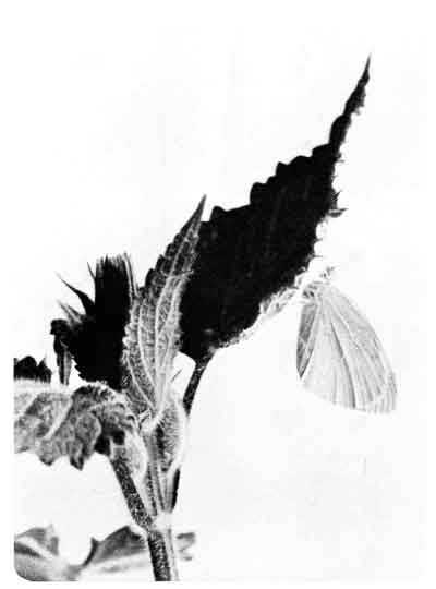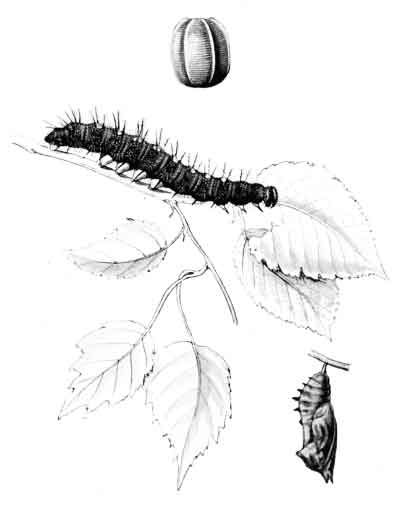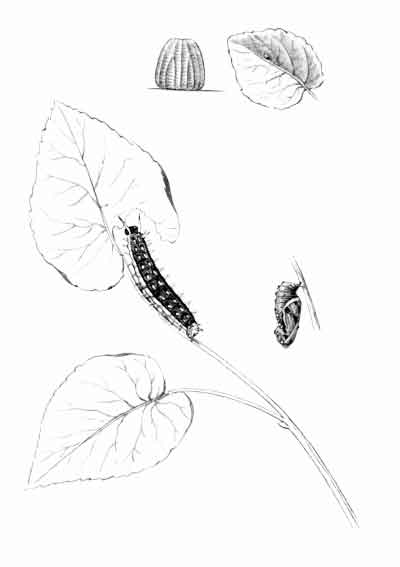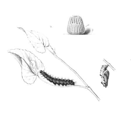 The egg "is of a long oval figure, half as long again as wide, the shell glistening, devoid of ribs or reticulation; at first white, then turning dull yellowish, and at last paler again, with the [Pg 188]dark head of the caterpillar showing through. The young caterpillar eats part of the empty egg-shell."