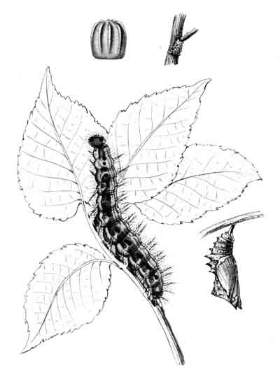 Eggs, natural size and enlarged; caterpillar and shelter; chrysalis in cocoon.