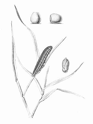 Living females received in June were placed on a growing plant of brome grass (Bromus asper), and a few eggs were deposited, some upon the blades of grass, others upon the gauze-covered glass jar in which the plant was placed; they were laid singly, firmly adhering to whatever laid upon. The first lot of eggs were deposited on June 14. The egg has a pearly appearance, being whitish or yellowish-white in colour. Ten days after the egg is deposited the young caterpillar emerges by eating away the crown. Soon after hatching out the young caterpillar makes a little tubular dwelling, drawing together the edges of the grass-blade by spinning about three or four stout cords of silk, which quickly contract, causing the edges to draw together, and sometimes to overlap, forming a compact short tube; generally before spinning it nibbles off the extreme edge of the blade where the silk is afterwards attached. It feeds upon the blade both above and below its abode, devouring so much that frequently only the midrib of the blade remains, and the tube only just long enough to conceal it; it then shifts its quarters, and prepares a new home.
