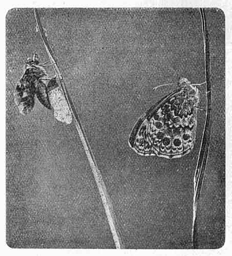 Immediately after hatching, many caterpillars eat the egg-shell for their first meal; they then settle down to the business of feeding and growing. It should be remembered that it is entirely on growth made whilst in the caterpillar stage that the size of a butterfly depends. In the course of a day or two the necessity arises for fasting, as moulting, an important event, is about to take place. Having spun a slender carpet of silk on a leaf or twig, the caterpillar secures itself thereto, and then awaits the moment when all is ready for the transformation to commence. After a series of twistings from side to side and other contortions, the skin yields along the back near the head, the head is drawn away from its old covering and thrust through the slit in the back, the old skin then peels downwards whilst the caterpillar draws itself upwards until it is free. The new skin, together with any hairs or spines with which it may be clothed, is at first very soft. In the course of a short time all is perfected, and the caterpillar is ready to enter upon its second stage of growth. At the end of the second stage the skin-changing operation is again performed, and the whole business is repeated two or more times afterwards. Finally, however, when the caterpillar has shed its skin for the last time, the chrysalis is revealed, but with the future wings seemingly free. These, together with the other organs, are soon fixed down to the body by the shell, which results from a varnish-like ooze which covers all the parts and then hardens.