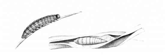 The young caterpillar figured on Plate 127 was on September 11 about half an inch in length, and had been removed from the grass tube, also shown, to be figured; the head was then pale brown, bordered and lined with purplish brown; the body was darkish green, paler on the last ring, and with darker [Pg 193]lines on the back and sides. After hibernation (the figure of this stage of the caterpillar is from Buckler), in May, the caterpillar is about one inch long, pale green in colour; the skin is thickly covered with very short dark brown bristles, "the head dirty white with a dark brown stripe down the outer edge of each lobe, the neck whitish-green" (Hellins).