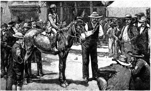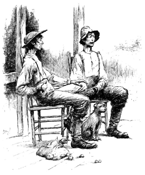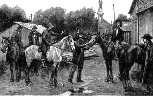 Over this road, then, and towards this town, one day, five summers ago, I was picking my course, but not without pale human apprehensions. At that time one did not visit Pineville for nothing. When I reached it I found it tense with repressed excitement. [286] Only a few days previous there had been a murderous affray in the streets; the inhabitants had taken sides; a dead-line had been drawn through the town, so that those living on either side crossed to the other at the risk of their lives; and there was blue murder in the air. I was a stranger; I was innocent; I was peaceful. But I was told that to be a stranger and innocent and peaceful did no good. Stopping to eat, I fain would have avoided, only it seemed best not to be murdered for refusing. All that I now remember of the dinner was a corn-bread that would have made a fine building stone, being of an attractive bluish tint, hardening rapidly upon exposure to the atmosphere, and being susceptible of a high polish. A block of this, freshly quarried, I took, and then was up and away. But not quickly, for having exchanged my horse for another, I found that the latter moved off as though at every step expecting to cross the dead-line, and so perish. The impression of the place was one never to be forgotten, with its squalid hovels, its ragged armed men collected suspiciously in little groups, with angry, distrustful faces, or peering out from behind the ambush of a window.