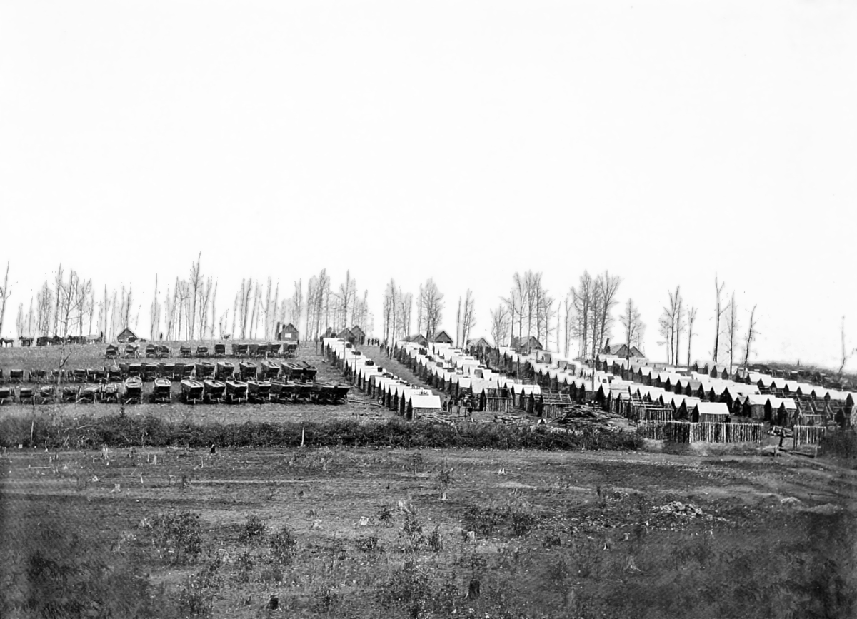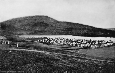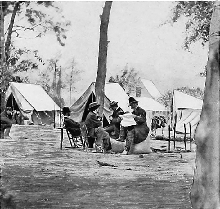 THIS photograph is selected from the seven thousand negatives left by Mathew B. Brady, the celebrated government photographer, as one of the most valuable in existence. It seems to be the first instance on the Western Continent, and possibly in the world, in which a camera successfully imprinted on glass the actual vision of a great army in camp. While scenes such as this are engraved on the memories of the venerable warriors who participated in the terrific struggle this remarkable negative preserves for all ages the magnificent pageant of men, who have offered their lives in defense of their country, waiting for the call to the battle-line. The photograph was taken on a day in the middle of May in 1862 when the Army of the Potomac was encamped at Cumberland Landing on the Pamunky River. A hundred thousand men rested in this city of tents, in the seclusion of the hills, eager to strike a blow for the flag they loved, yet such was the tragic stillness that one who recalls it says that absolute quiet reigned throughout the vast concourse like the peace of the Sabbath-day. On every side were immense fields of wheat, promising an abundant harvest, but trammeled under the feet of the encroaching armies. Occasionally the silence was broken by the strains of a national song that swept from tent to tent as the men smoked and drowsed, fearless of the morrow. The encampment covered many square miles and this picture represents but one brigade on the old Custis place, near White House, which became the estate of General Fitzhugh Lee, the indomitable cavalry leader of the Confederacy and an American patriot during the later war with Spain. The original negative, although now forty-five years old, has required but slight retouching in the background.