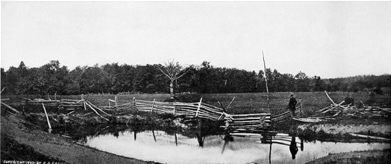 SECRET SERVICE GUIDE DIRECTING BRADY TO SCENE OF ACTION—Pointing toward the edge of the woods where General Reynolds was killed at Gettysburg in July, 1863—Brady carried his cameras onto this field