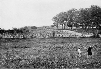 BRADY ON THE BATTLEFIELD OF GETTYSBURG IN JULY 1863—The smoke of the terrific conflict had hardly cleared away when Brady's "What is it" wagon rolled onto the bloody "wheat field"—This picture shows Brady looking toward McPherson's woods on the left of the Chambersburg Pike at the point near which the Battle of Gettysburg began