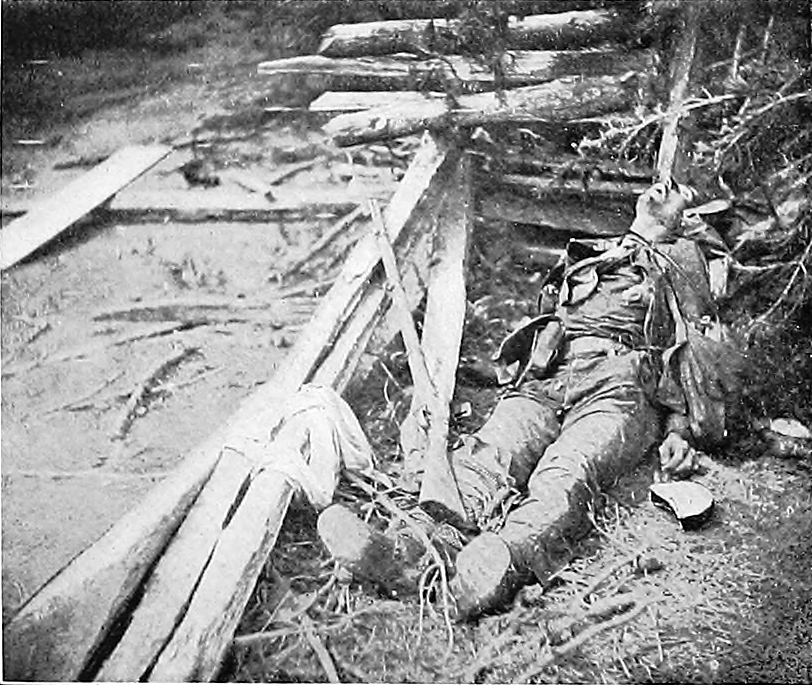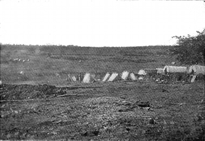 "THE black art," by which Brady secured these photographs, was as mystifying as the work of a magician. It required a knowledge of chemistry and, considering the difficulties, one wonders how Brady had courage to undertake it on the battle-field. He first immersed eighty grains of cotton-wool in a mixture of one ounce each of nitric and sulphuric acids for fifteen seconds, washing them in running water. The pyroxylin was dissolved in a mixture of equal parts of sulphuric ether and absolute alcohol. This solution gave him the ordinary collodion to which he added iodide of potassium and a little potassium bromide. He then poured the iodized collodion on a clean piece of sheet glass and allowed two or three minutes for the film to set. The coated plate was taken into a "dark room," which Brady carried with him, and immersed for about a minute in a bath of thirty grains of silver nitrate to every ounce of water. The plate was now sensitive to white light and must be placed immediately in the camera and exposed and developed within five minutes to get good results, especially in the South during the summer months. It was returned to the dark room at once and developed by pouring over it a mixture of water, one ounce; acetic acid, one dram; pyrogallic acid, three grains, and "fixed" by soaking in a strong solution of hyposulphite of soda or cyanide of potassium. This photograph shows Brady's "dark room" in the Confederate lines southeast of Atlanta, Georgia, shortly before the battle of July 22, 1864. It is a fine example of wet-plate photography.