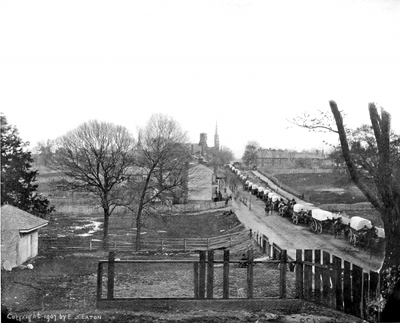THE lens here perpetuates the interesting spectacle of an army wagon train being "parked" and guarded from a raid by the enemy's cavalry. With a million of the nation's strongest men abandoning production to wage devastation and destruction the problem of providing them with food barely sufficient to sustain life was an almost incalculable enigma. The able-bodied men of the North and the South had turned from the fields and factories to maintain what both conscientiously believed to be their rights. Harvests were left to the elements and the wheels of industry fell into silence. The good women and children at home, aided by men willing but unable to meet the hardships and exposures of warfare, worked heroically to hold their families together and to send to their dear ones at the battle-front whatever comforts came within their humble power. The supply trains of the great armies numbered thousands of six-mule teams and when on the march they would stretch out for many miles. It was in May, in 1863, that one of these wagon trains safely reached Brandy Station, Virginia. Its journey had been one of imminent danger as both armies were in dire need of provisions and the capture of a wagon train was as good fortune as victory in a skirmish. To protect this train from a desperate dash of the Confederate cavalry it was "parked" on the outskirts of a forest that protected it from envious eyes and guarded by the Union lines. One of Mr. Brady's cameras took this photograph during this critical moment. It shows but one division of one corps. As there were three divisions in each corps, and there were many corps in the army, some idea of the immense size of the trains may be gained by this view. The train succeeded in reaching its destination at a time of much need.