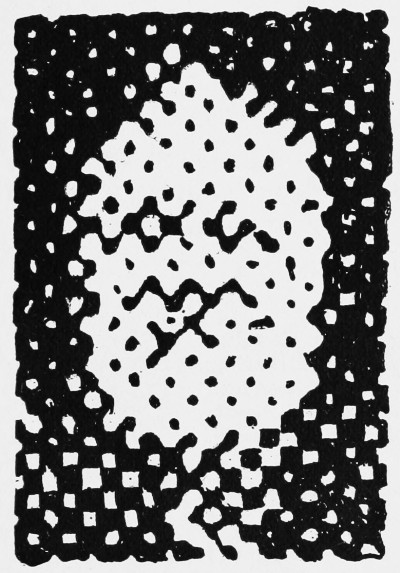 A curious optical effect which in part illustrates the change in appearance under different aspects is reproduced in Fig. 7. In this case the enchantment of distance is necessary to produce the transformation. Viewed at the usual reading distance, we see nothing[Pg 307] but an irregular and meaningless assemblage of black and white blotches. At a distance of fifteen to eighteen feet, however, a man's head appears quite clearly. Also observe that after the head has once been realized it becomes possible to obtain suggestions of it at nearer distances.