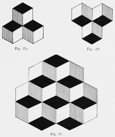 [5] In order to obtain the effects described in the various illustrations it is necessary in several cases to regard the figures for a considerable time and with close attention. The reader is requested not to give up in case the first attempt to secure the effect is not successful, but to continue the effort for a reasonable period. Individuals differ considerably in the readiness with which they obtain such effects; in some cases, such devices as holding the diagrams inverted or at an angle or viewing them with the eyes half closed are helpful.