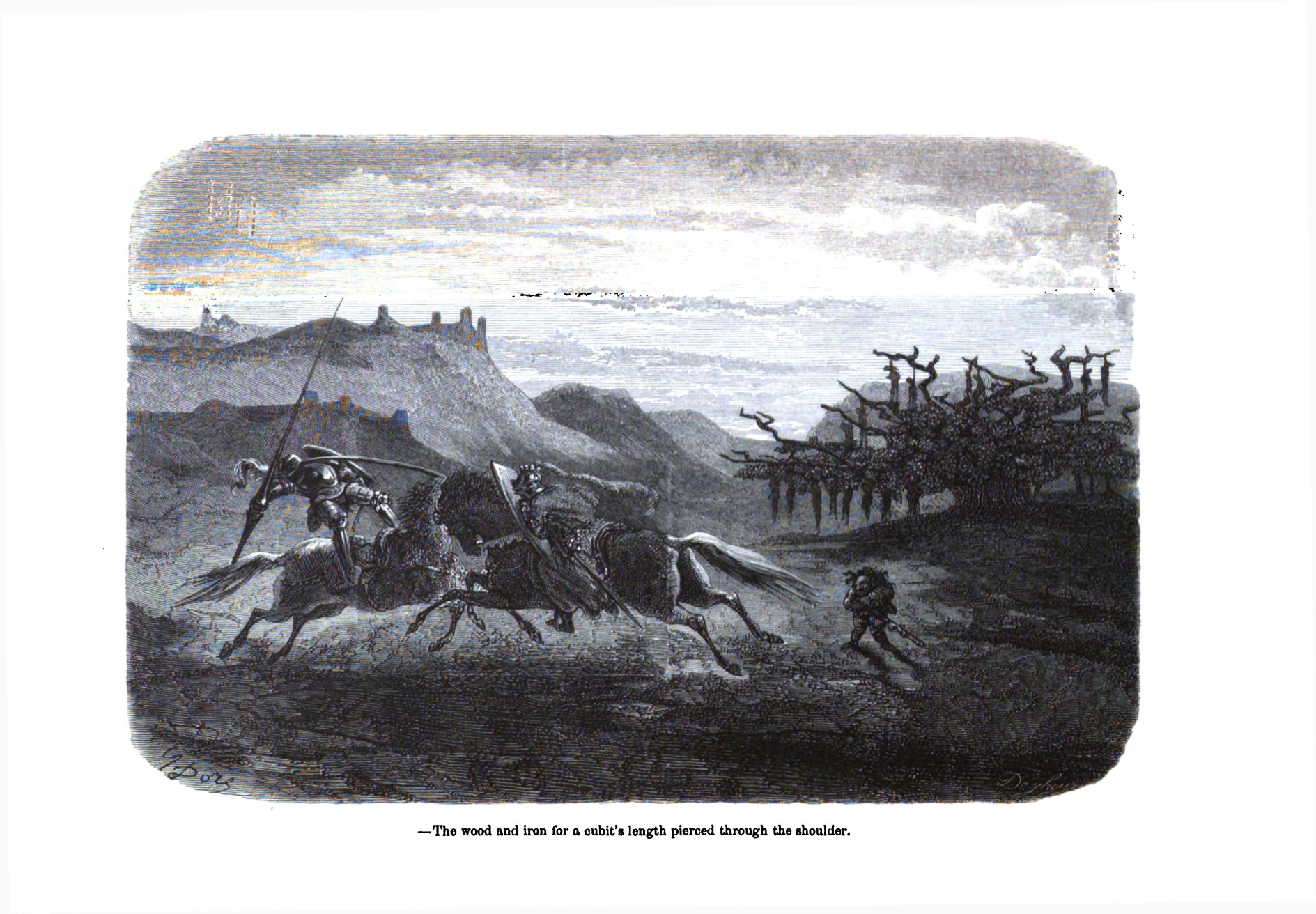 “I am that weeping dame who did entreat you to defend her rights 'gainst Felon d'Albaru, a wicked wretch, 144whom God confound! This monster, who doth not deserve the name of knight, since he doth naught but plan most villain acts and set vile snares, bears on his shoulders more the head of horse or bull than that of living man. His eyes are large as eggs; his features horrible; his lips are thick and black; his fangs project from out his mouth, which is itself huge as a leopard's jaw; and against nature are his frightful shape, distended body, and misshapen legs.