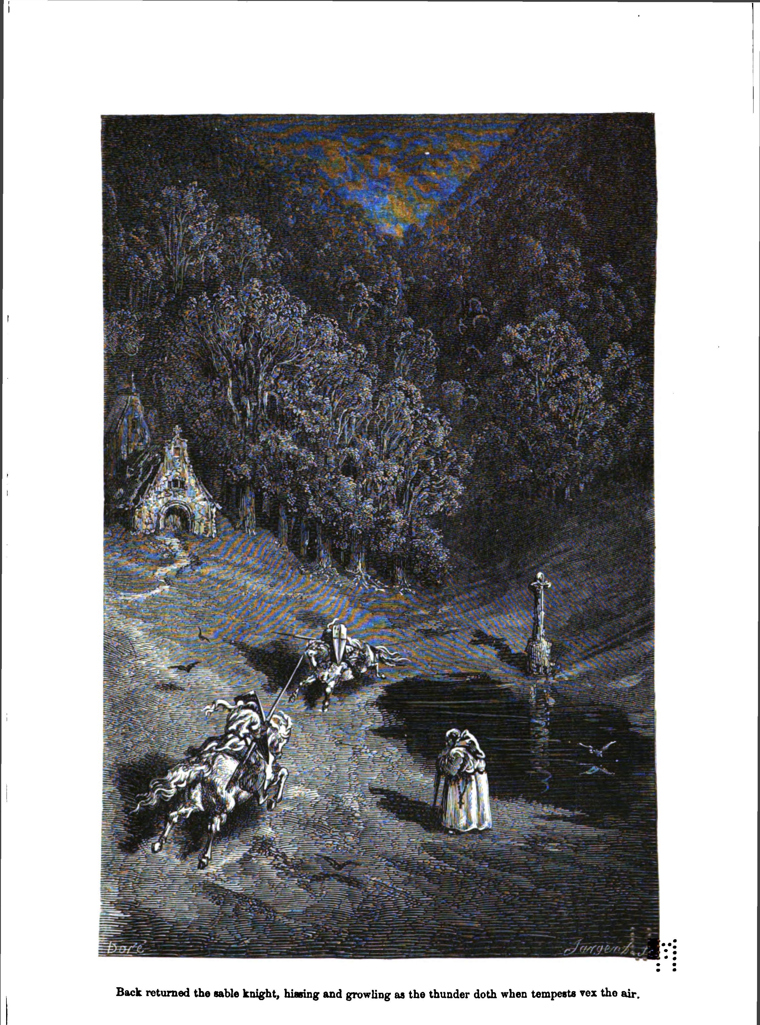 “Knights!” he exclaimed aloud, “hie hither! help to our good lord! and may the laggard never sit at his Round Table more! We should indeed deserve dishonoured names were the king lost for want of timely aid.” As thus he spoke, he flew towards the beast, not waiting for the rest, and couched his lance as though to strike at it.