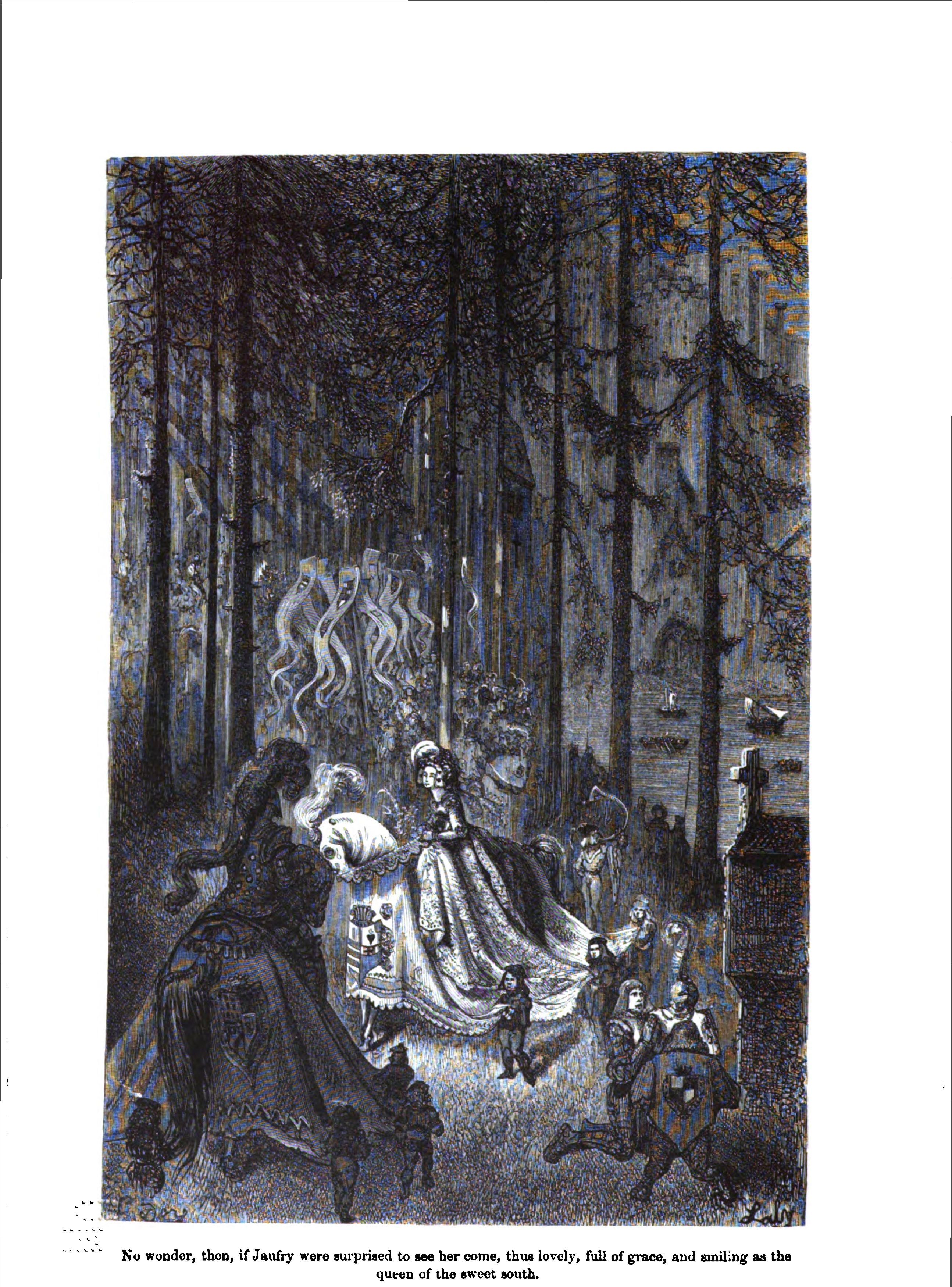 As thus the cavalcade rode gaily off, headed by Jaufry and fair Brunissende, they saw approach two ladies dressed in black, with eyes all red and swimming with fresh tears. Jaufry saluted them, and then inquired for tidings of Lord Melyan; but one of them in under-tone replied, and with a sigh, that of Lord Melyan nothing did she know; she thought but of her woes. *