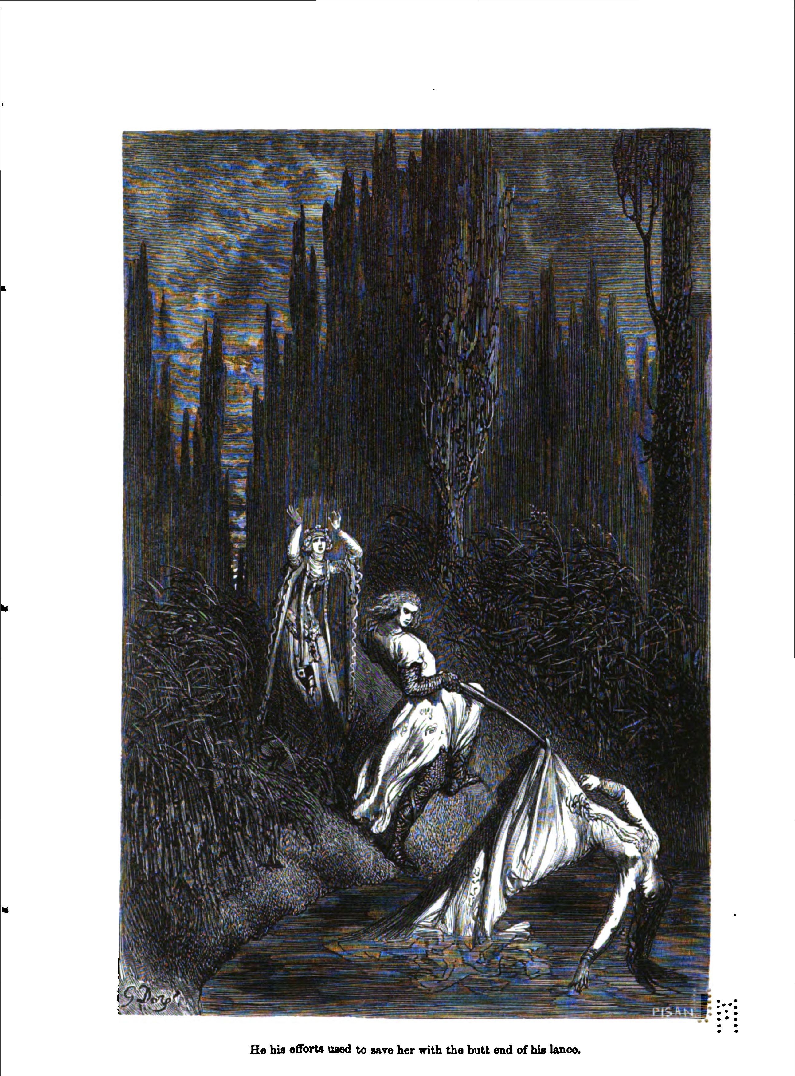 Jaufry advanced; and there, in truth, he saw, within the waters battling with death, a dame, who now appeared, now slid beneath the wave. He soon alighted, and his efforts used to save her with the butt-end of his lance; but whilst his arm was thus outstretched, and he stood by the brink, the damsel pushed him with such hearty will, at once he toppled in, which she perceiving, leapt in after him.