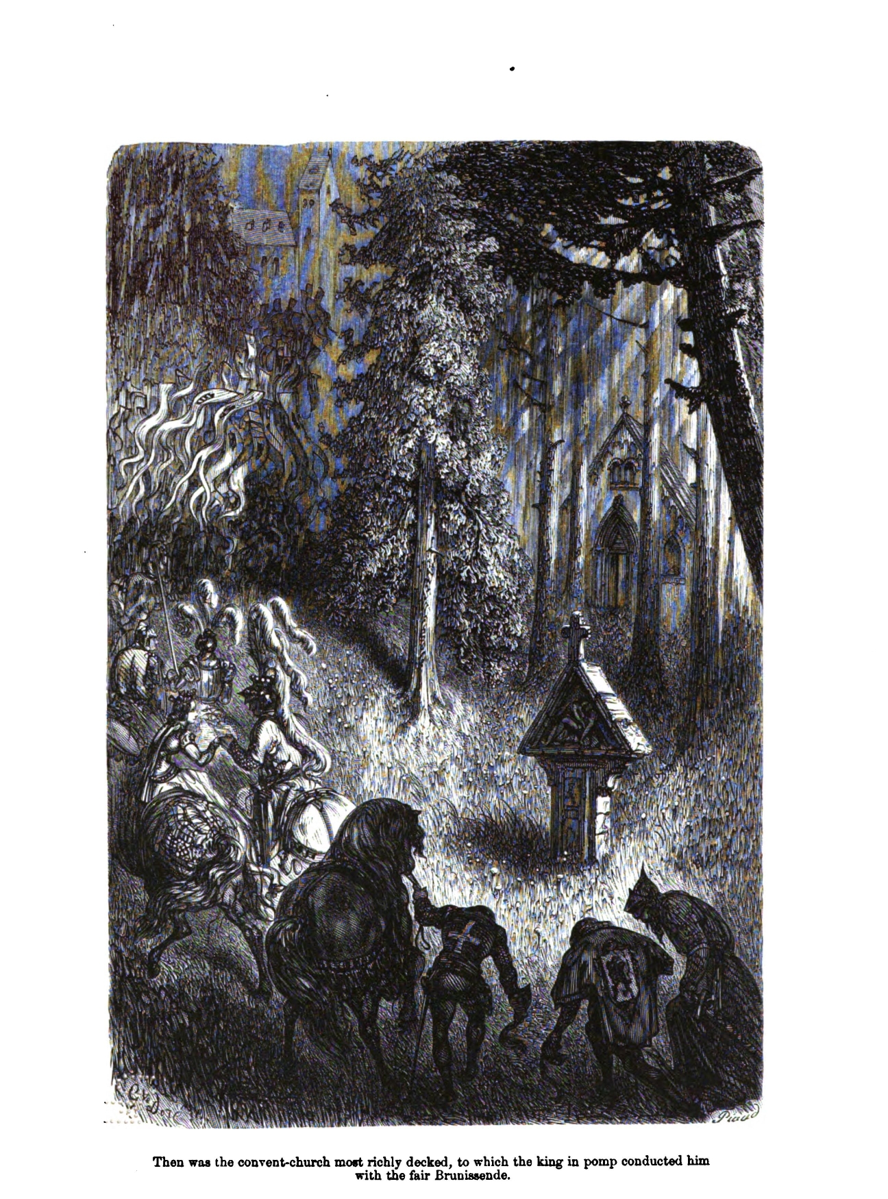Saying the words, he led Sir Jaufry in to good Queen Guenever, who, as she tended him her rosy cheek, thanked him with warmth for having 'venged her cause on Taulat. King Arthur on his side did give him thanks for all the precious gifts he there had sent,—the fair white ashen lance, the yeoman's dwarf and e'en the leper's too, Estout de Verfeil and the captive knights, Melyan, and Taulat's numerous prisoners, with Eclon d'Albaru; then was the convent-church most richly decked, to which the king in pomp conducted him with the fair Brunissende.