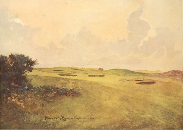 The course at Troon is perhaps a little overshadowed by its more famous neighbour, but it is a very fine course nevertheless, especially since it has been lengthened of late years. It has, moreover, one of the finest short holes to be found anywhere. Here dwells Willy Fernie, and here it was that Braid and Herd went down so memorably before Vardon and Taylor in the great foursome over four greens. The Scottish pair left St. Andrews with a small advantage, but in Ayrshire a terrible thing befell them. Taylor and Vardon won so many holes—the number was well in double figures—that they came to the two English courses, St. Anne’s and Deal, with a lead that nothing but a second miracle could take from them—and such miracles do not happen twice; it was surely one of the most extraordinary day’s play in all the history of big matches. Troon, oddly enough, is one of the last places that one would expect such a collapse to occur. We know that when the greens are fast and fiery and not a little rough, a man who becomes afraid of his putter can lose an unlimited number of holes, but the greens at Troon are smooth and true, and of an almost velvety consistency that encourage us to putt above our form. They are certainly one of the features of the course.