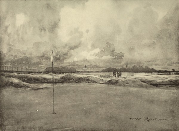 A first glance at the course produces much the same effect on the mind as does Hoylake. It looks a little flat, and bare, and even dull; we do not see where the holes are and whence and whither the players are going and what they are trying to do. As at Hoylake, the first impression is utterly wrong, as we soon discover when we begin to play, more especially if we have been maltreated by the Irish Channel on the previous evening. The first thing that strikes us is that we ought to be beginning with a nice symmetrical row of fours, and that ugly disfiguring fives will insist on creeping in. At the first we really ought to do a four, but still there are a variety of things to prevent such a consummation: a pot-bunker to catch a pulled tee-shot, a bunker in the right-hand side of the green, and a considerable possibility of taking three putts on a green which is as good as it is usually fast and difficult. At the second the trouble is of a bolder and, in a sense, a more commonplace character, a large and ravenous bunker, which must be carried with a good second shot, and then turning back towards the club again we play a hole where almost meticulous accuracy is necessary if we are to get the perfect four, wherein the fourth shot consists of our opponent saying, contrary to the recommendations of the Rules of Golf Committee, “That will do.” Crooked driving may be definitely punished by pot-bunkers, or, if we are lucky, it may only entail the most difficult of approach shots, in which we may have to try a pitch of really desperate difficulty over flanking bunkers. Only if we drive with absolute accuracy we shall be properly rewarded by being able to play a pitch and run shot straight—or let us hope so at least—up to the flag.
