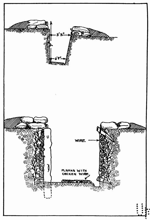 Some kind of floor should be provided for the trenches. The simplest and best are made in the following way: Take two seven-inch boards about ten feet in length, nail them together to[72] make a fourteen-inch plank, and then cover the whole with fairly fine chicken wire. Place these boards on the ground with the side on which the wires are joined downwards. They keep the feet from slipping, are easily cleaned by being upended when they are dry, and allow the space under them to be reached easily to pick up scraps of food, etc. There is nothing more heart breaking than having to pursue your weary course for miles, sometimes, up trenches with slippery sides and sloping, wet, treacherous bottoms.