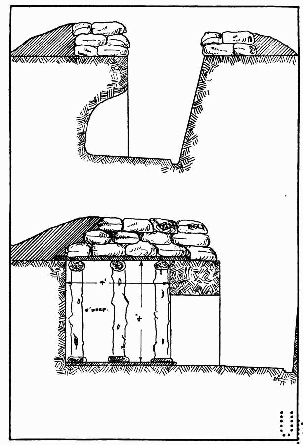 In each trench there must be dugouts for the men to sleep in. The first ones that are made will be very primitive, and will be very much like a fireplace in a room—simply excavations in the back wall of the trench almost on a level with the bottom of it. At first they used to be dug in the front of the trench, but this practice was discontinued as it was found to weaken the power of resistance of the very important parapet. In the course of time more labour can be expended upon the dugouts, and it will be found advisable to construct them of uniform size, six feet long by four feet wide by four feet high. By having them uniform we give the engineers a chance to make frames that can be used to support the roof and the sides and bring them[73] well from the rear to construct the dugouts. These dimensions do not make a very commodious home for four men, but never more than three of a section (of four) are off duty at the same time, and besides there is considerable danger in having large dugouts, as they present a correspondingly larger target for the guns. A direct hit on a large dugout will often bring the whole thing crashing about the ears of the inhabitants. My own adjutant and one of my brother officers were killed by falling beams in large dugouts. The entrance to the dugouts must be kept as small as possible so as to protect the occupants from shells that fall just outside.