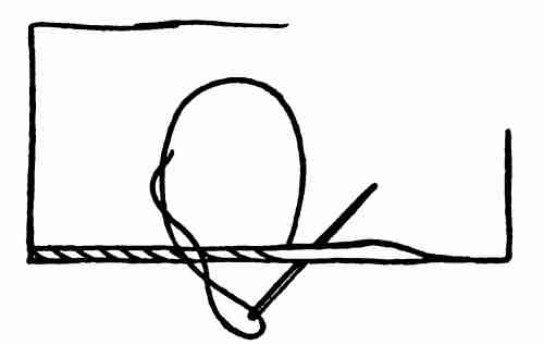 Whenever you can avoid making a knot, do so, because it spoils the look of your work on the wrong side. You can start your work, if it is a seam, for example, by making two or three stitches on top of each other. Follow the thread of the warp or woof[15] of the material as much as possible. After fastening your thread, make two fine running stitches forward and one back. Keep the stitches the same length.