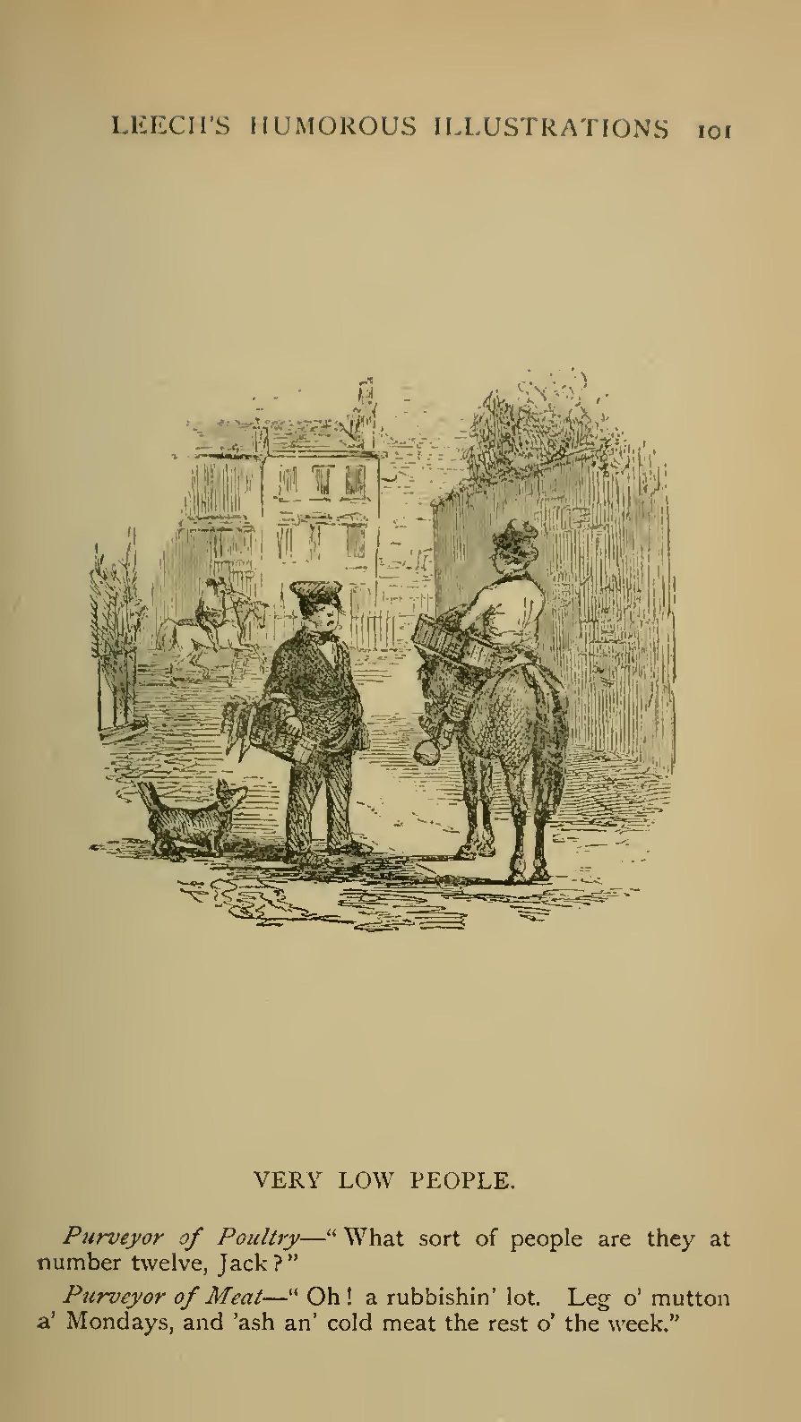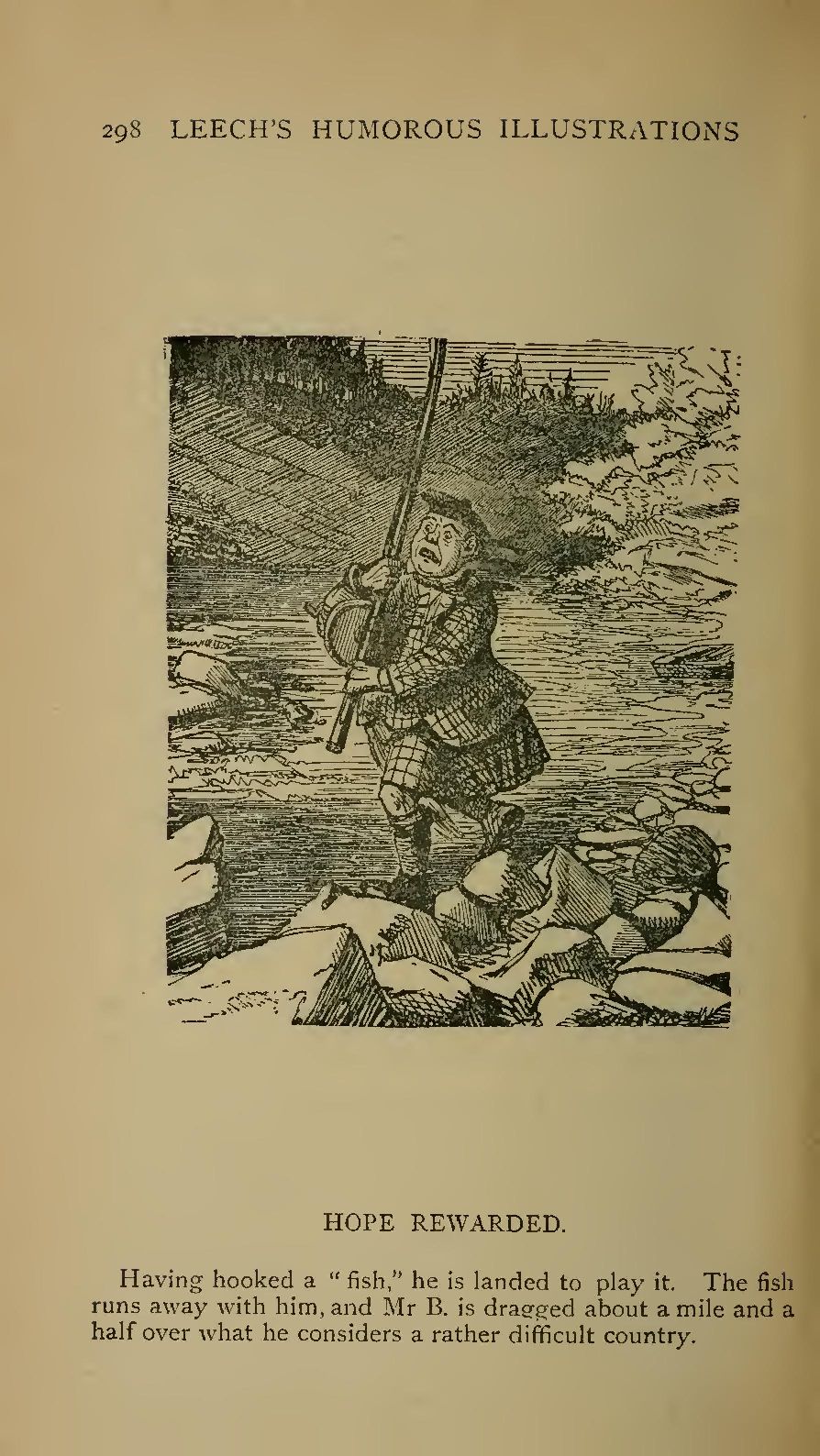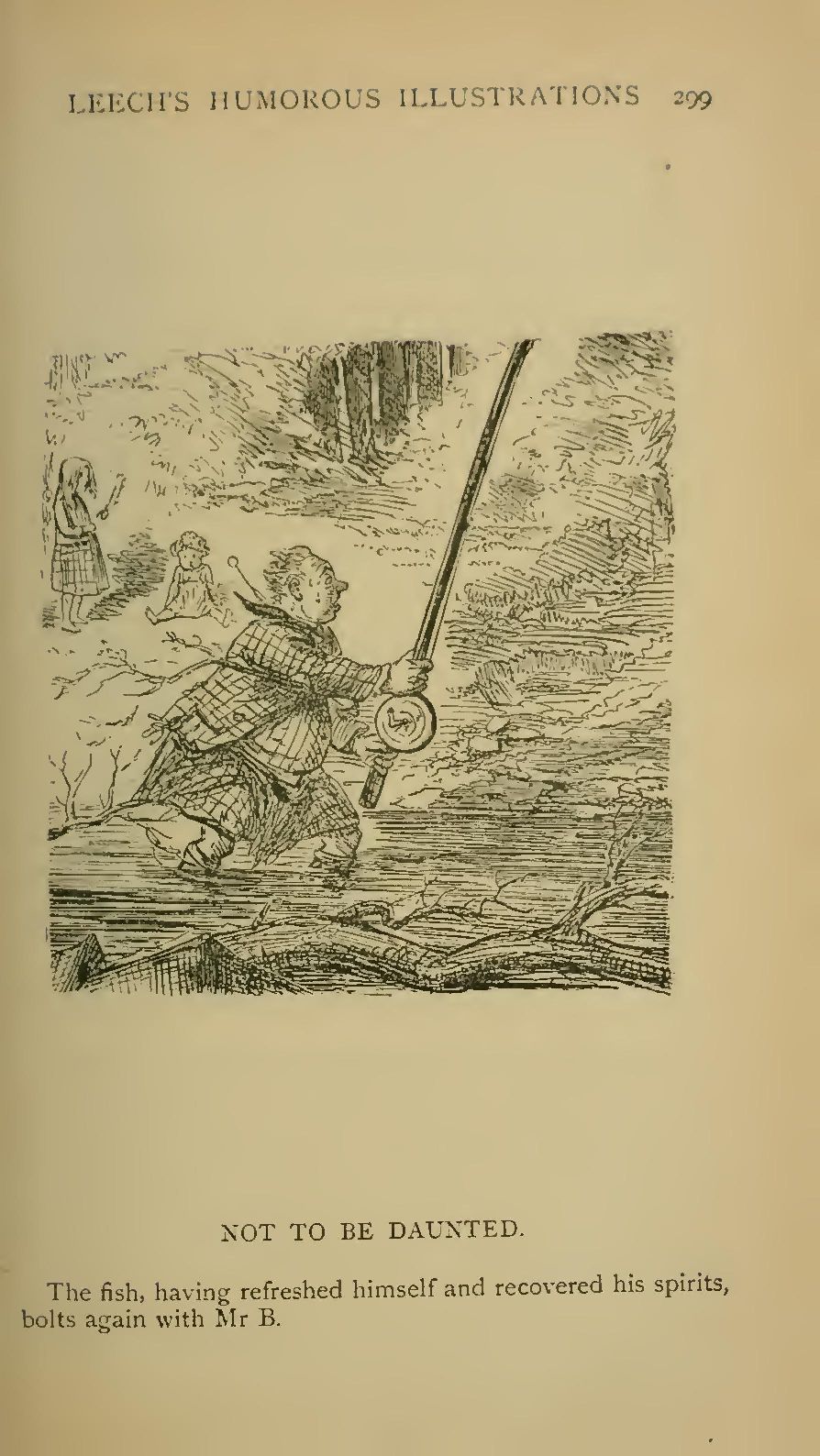 But in August of 1841 Leech began the great work of his life—a work, indeed, which he never quitted but with life—namely, his connection with Punch. The first number of Punch was issued on the 17th July, 1841, and Leech's first contribution to it appeared on the 7th August, in the fourth number. For about twenty years, it may be said, he was its leading spirit, and, by his contributions to its pages, got in all about £40,000. Political caricatures he produced by the score, and held up to ridicule many of the absurd customs of the pretensious and exclusive sections of Society. Like Thackeray and Dickens, Leech detested snobbery in all walks of life, and depicted it unsparingly in a way that it never had been dealt with before. Week after week there flowed from his pencil an endless stream of scenes of high life and low life, of indoor life and street life, now of England, and then of foreign lands, and of all times, seasons, and occasions, as also numerous scenes of deer-stalking and fishing, and of horses and hounds, in all cases depicting whatever he undertook with extraordinary accuracy combined with infinite humour. Also, when social or national wrong called for grave censure, Leech knew how to administer it, not only without giving unnecessary offence, but in the way best calculated to bring about reform and redress. In all circumstances he was essentially a humorist, and he found his most genial vocation in depicting life and character in the social circles he frequented. As a keen observer of the everyday life around him, he delighted to depict the corporation magnate, the artist, the medical student, the spendthrift, the policeman, the cab driver, the coster, the carman, and hundreds of other such phases of everyday life and character, seeing humour and drollery where others failed to observe anything but the commonest aspects of everyday monotony. Of course it should not be forgotten that, if Leech did great things for Punch, his connection with that journal gave him great opportunities, and brought him into the very forefront of British artists. He was considered the most successful humorist of the day, and his pencil was in constant request. In the course of years he became the illustrator of about eighty volumes. When it is realised that the sketches in Punch and the illustrations in these eighty volumes combined amount to some thousands in number, the mind is much impressed with the great amount of industry and application that Leech displayed throughout life. Even a tour to the Highlands, or to Ireland, or an outing to any portion of the country, was at all times turned to practical account for work later on.