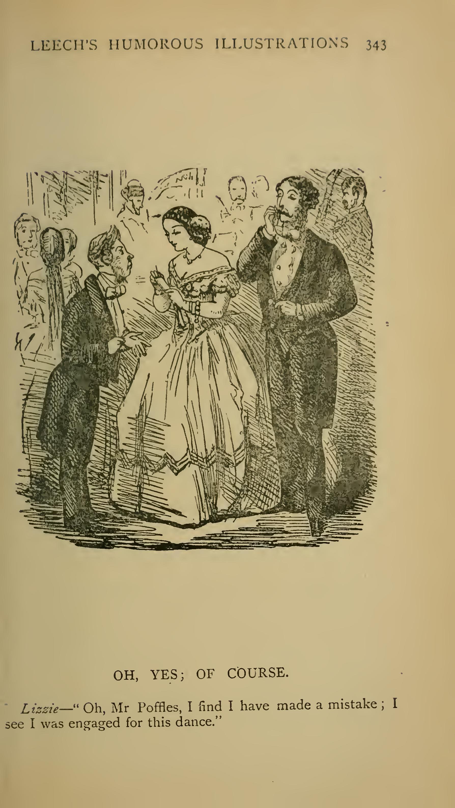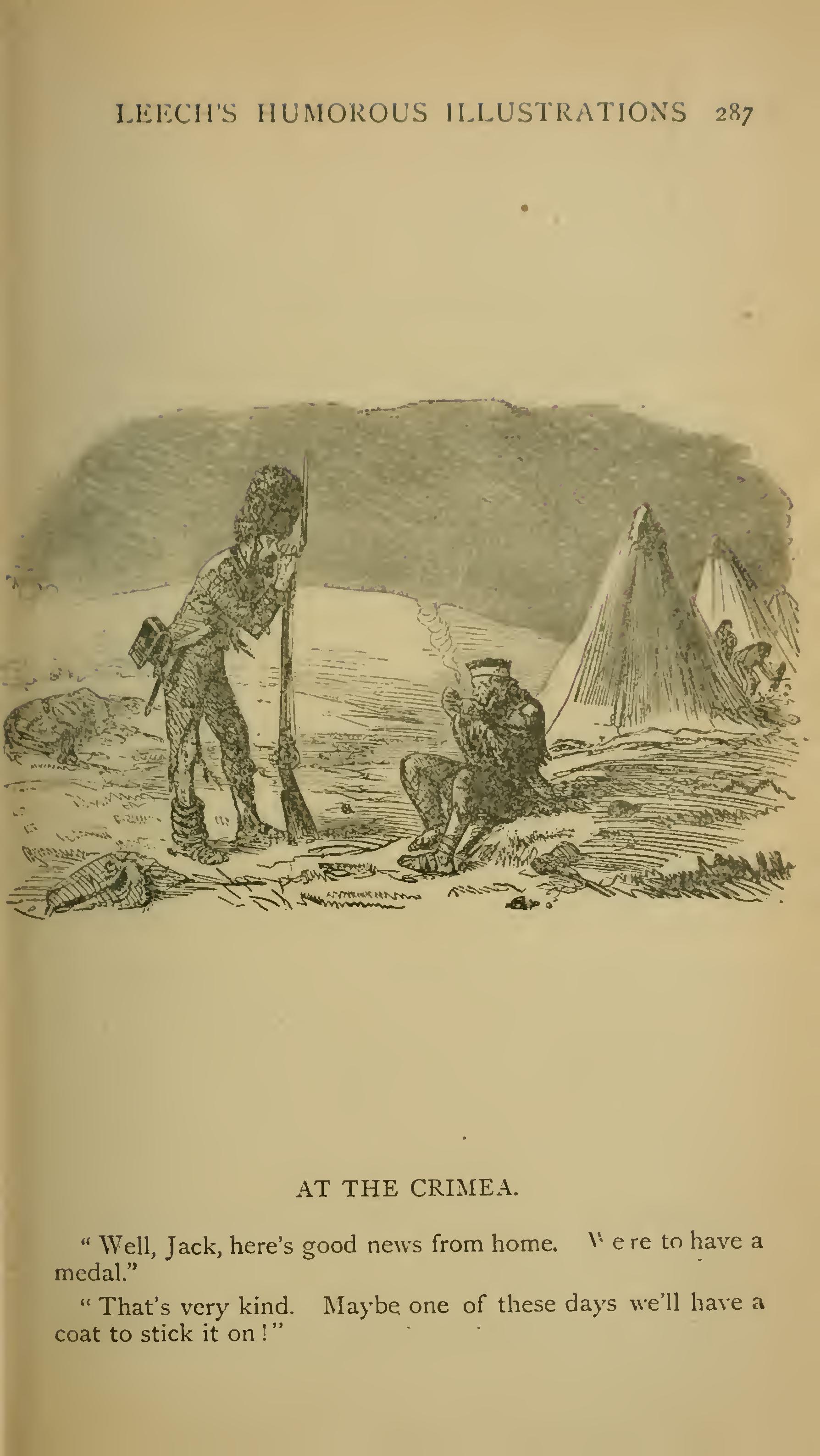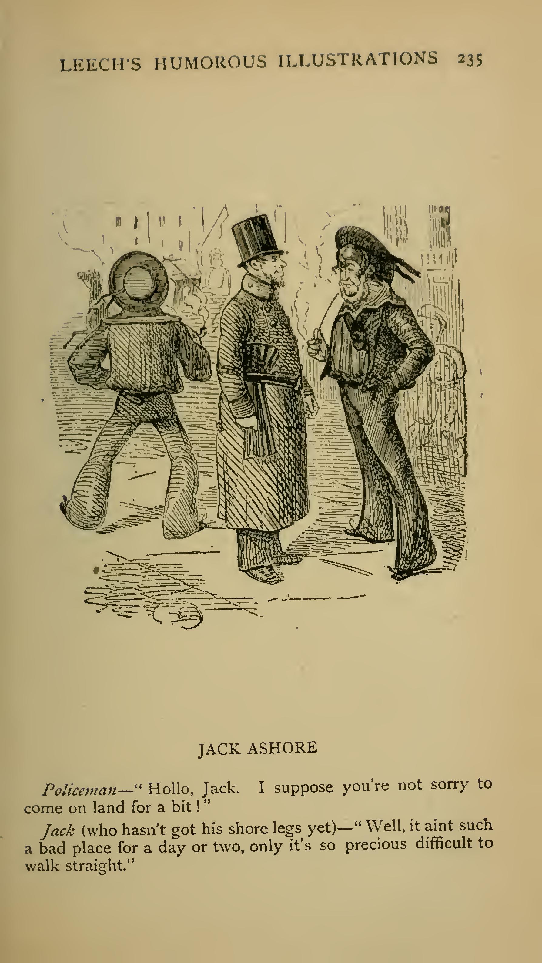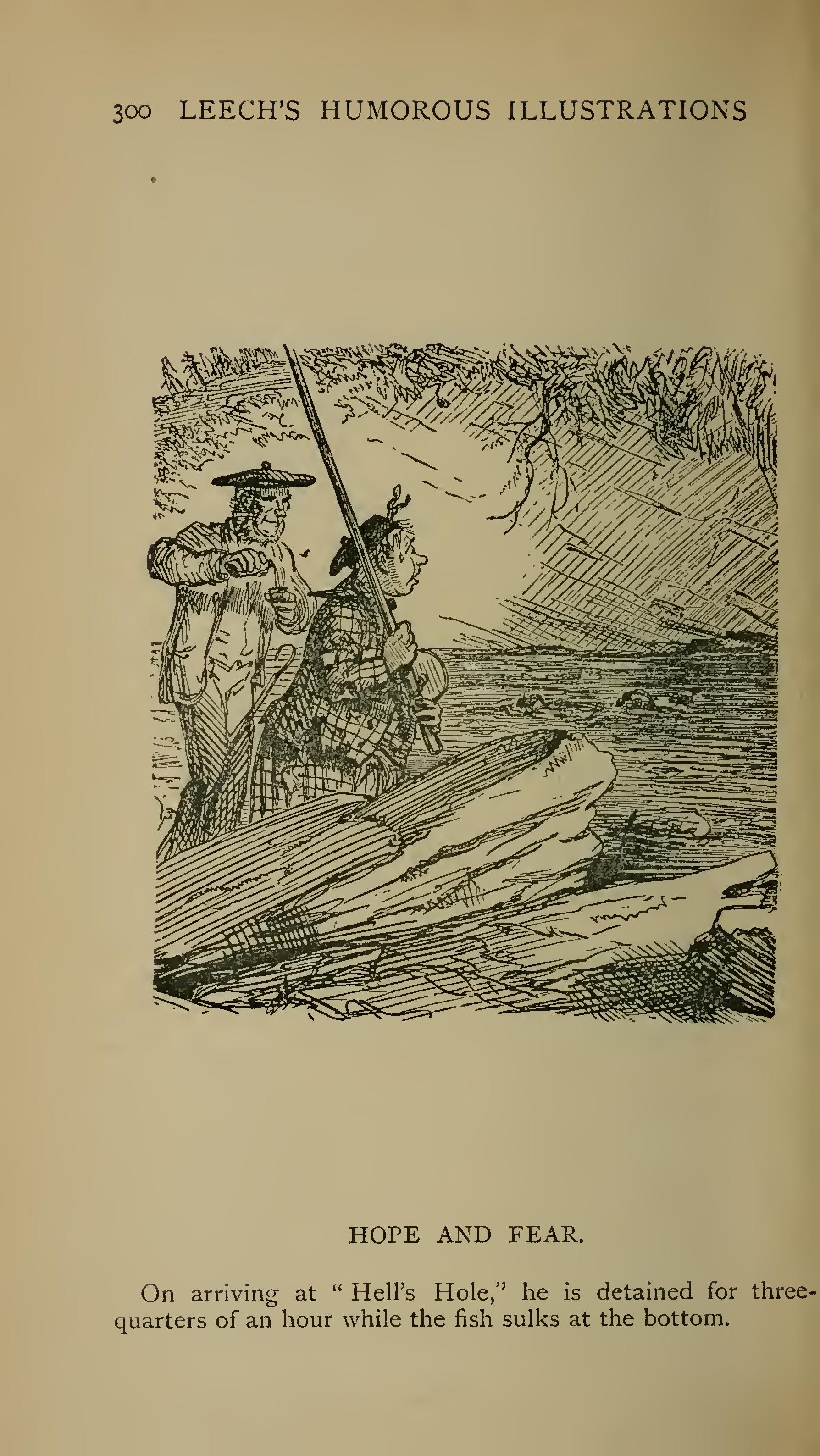 But in August of 1841 Leech began the great work of his life—a work, indeed, which he never quitted but with life—namely, his connection with Punch. The first number of Punch was issued on the 17th July, 1841, and Leech's first contribution to it appeared on the 7th August, in the fourth number. For about twenty years, it may be said, he was its leading spirit, and, by his contributions to its pages, got in all about £40,000. Political caricatures he produced by the score, and held up to ridicule many of the absurd customs of the pretensious and exclusive sections of Society. Like Thackeray and Dickens, Leech detested snobbery in all walks of life, and depicted it unsparingly in a way that it never had been dealt with before. Week after week there flowed from his pencil an endless stream of scenes of high life and low life, of indoor life and street life, now of England, and then of foreign lands, and of all times, seasons, and occasions, as also numerous scenes of deer-stalking and fishing, and of horses and hounds, in all cases depicting whatever he undertook with extraordinary accuracy combined with infinite humour. Also, when social or national wrong called for grave censure, Leech knew how to administer it, not only without giving unnecessary offence, but in the way best calculated to bring about reform and redress. In all circumstances he was essentially a humorist, and he found his most genial vocation in depicting life and character in the social circles he frequented. As a keen observer of the everyday life around him, he delighted to depict the corporation magnate, the artist, the medical student, the spendthrift, the policeman, the cab driver, the coster, the carman, and hundreds of other such phases of everyday life and character, seeing humour and drollery where others failed to observe anything but the commonest aspects of everyday monotony. Of course it should not be forgotten that, if Leech did great things for Punch, his connection with that journal gave him great opportunities, and brought him into the very forefront of British artists. He was considered the most successful humorist of the day, and his pencil was in constant request. In the course of years he became the illustrator of about eighty volumes. When it is realised that the sketches in Punch and the illustrations in these eighty volumes combined amount to some thousands in number, the mind is much impressed with the great amount of industry and application that Leech displayed throughout life. Even a tour to the Highlands, or to Ireland, or an outing to any portion of the country, was at all times turned to practical account for work later on.