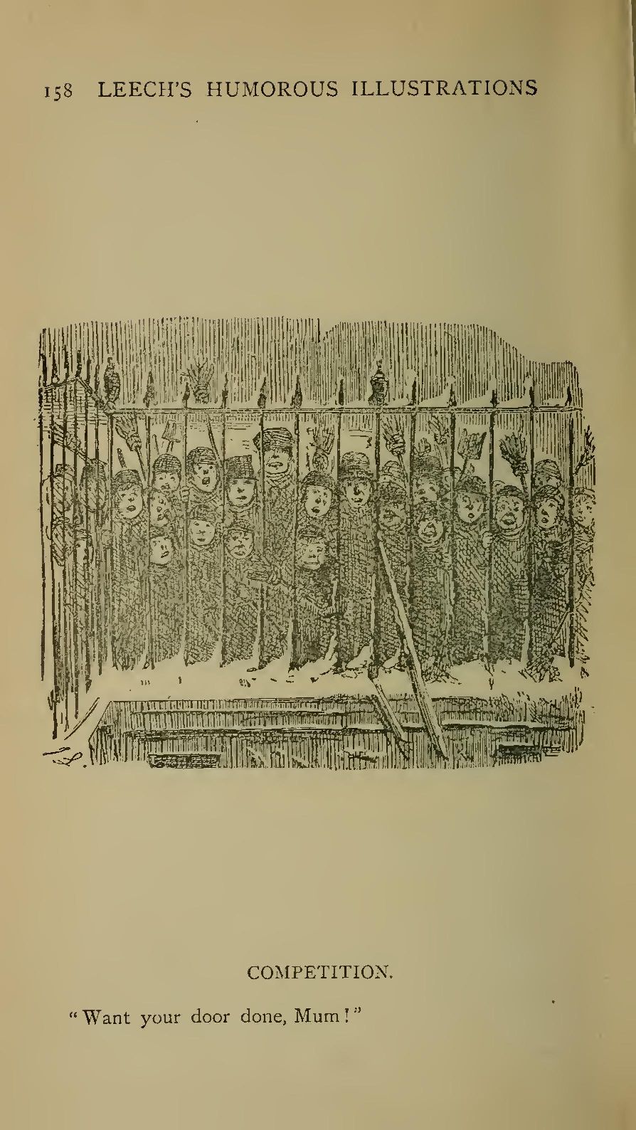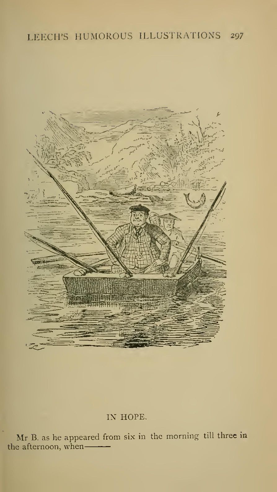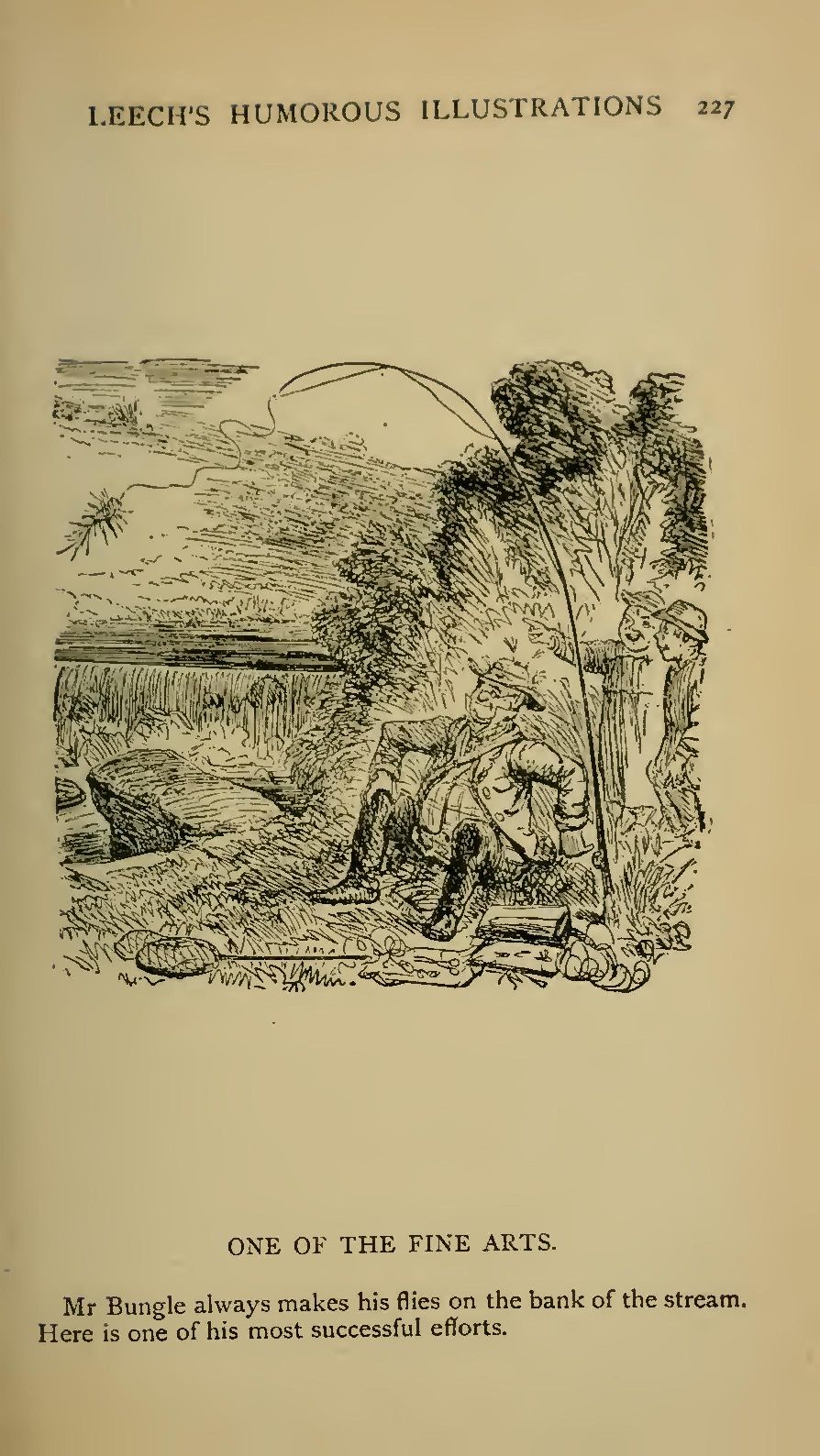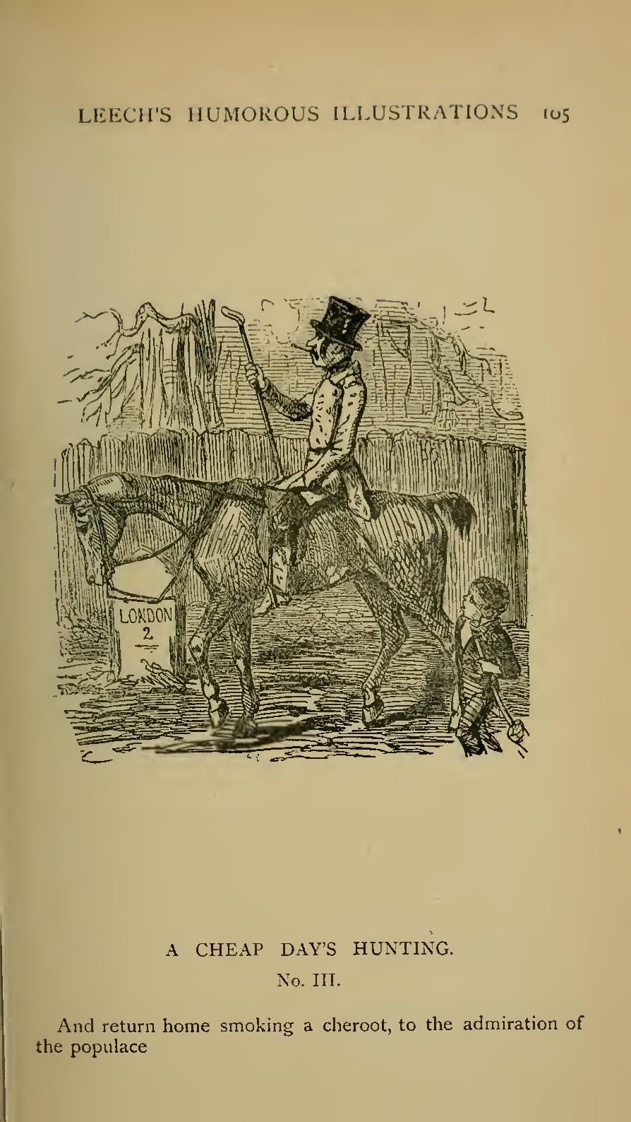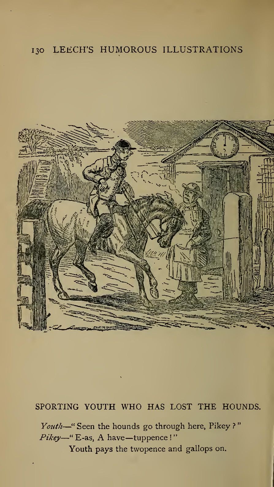 At eighteen years of age, Leech published his first work, entitled "Etchings and Sketchings by A. Pen, Esq." It was a small work of four quarto sheets. As he got more and more engrossed in artistic work, the young student seems to have gradually given up his medical studies, and to have resolved to live by his pencil. In course of time he turned his attention to lithography, and, having drawn pictures upon lithographic stones, he has been known to spend many a weary day in carrying such heavy stones from publisher to publisher in search of a buyer. But as his fame increased, the difficulty of getting remunerative employment rapidly diminished. A good deal of Leech's early work, among other things, was in connection with Bell's Life in London, the best-known sporting paper of the time. Here he was associated with Cruikshank, Madons, "Phiz," and Seymour. It was when at work for Bell's Life that he first imbibed a taste for field sports, which developed into a strong feature in his pictorial career. He joined the hounds in Herefordshire, where Millais became his fellow pupil in acquiring the arts of the chase. Among the schemes of drollery that our artist participated in about this time was the Comic Latin Grammar, Leigh contributing the text, and Leech the illustrations. This was followed by the Comic English Grammar, and likewise by the Children of the Mobility, a parody on a well-known work devoted to the serious glorification of our juvenile aristocracy.