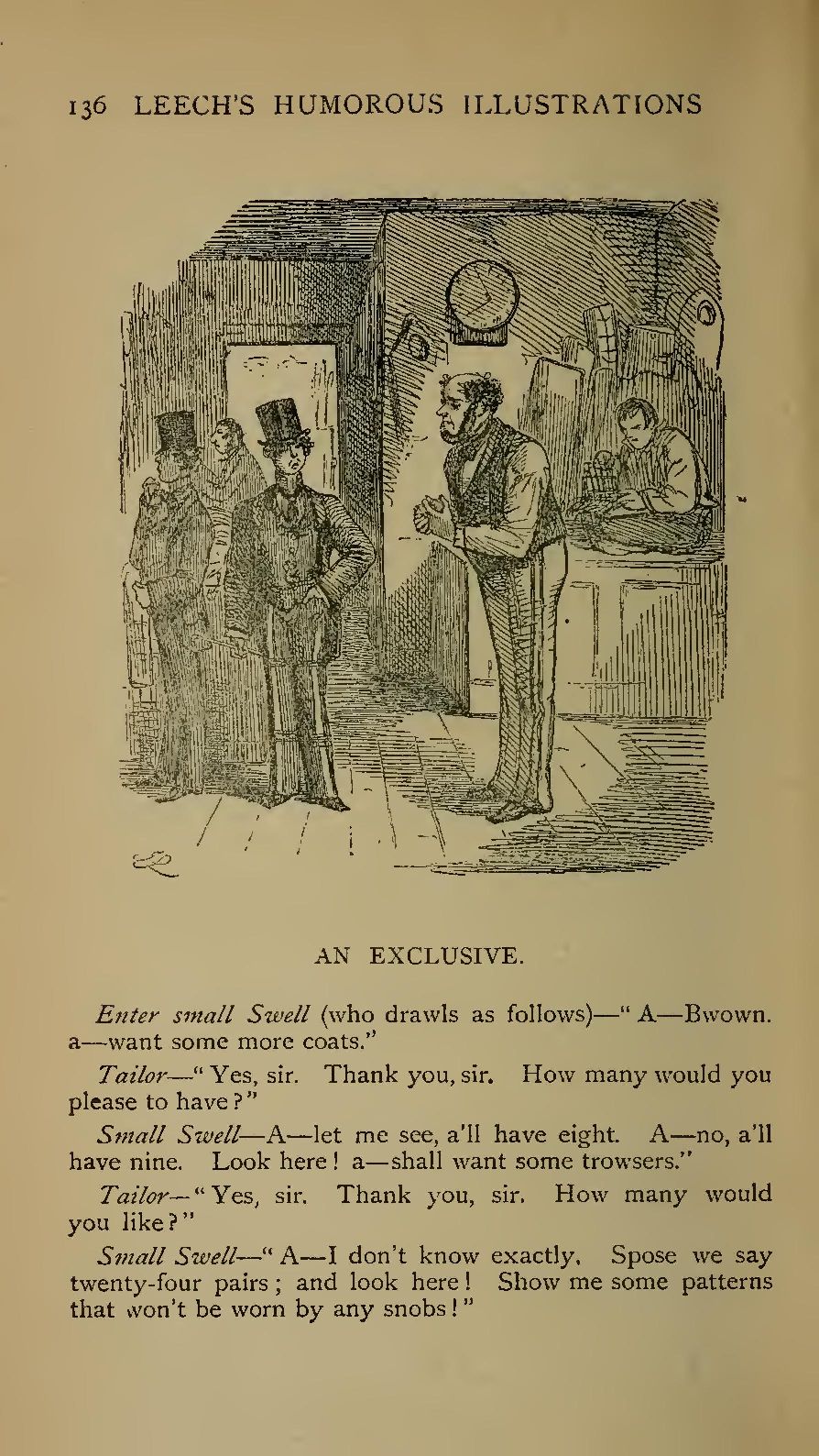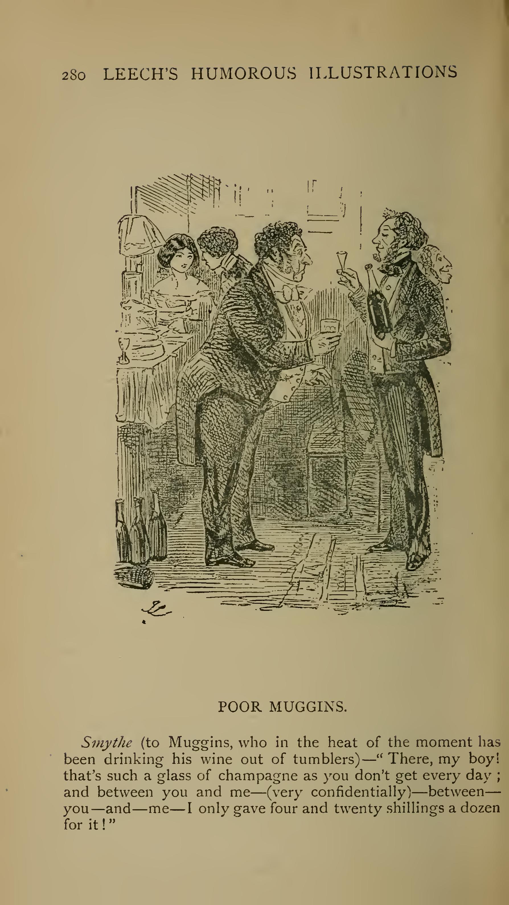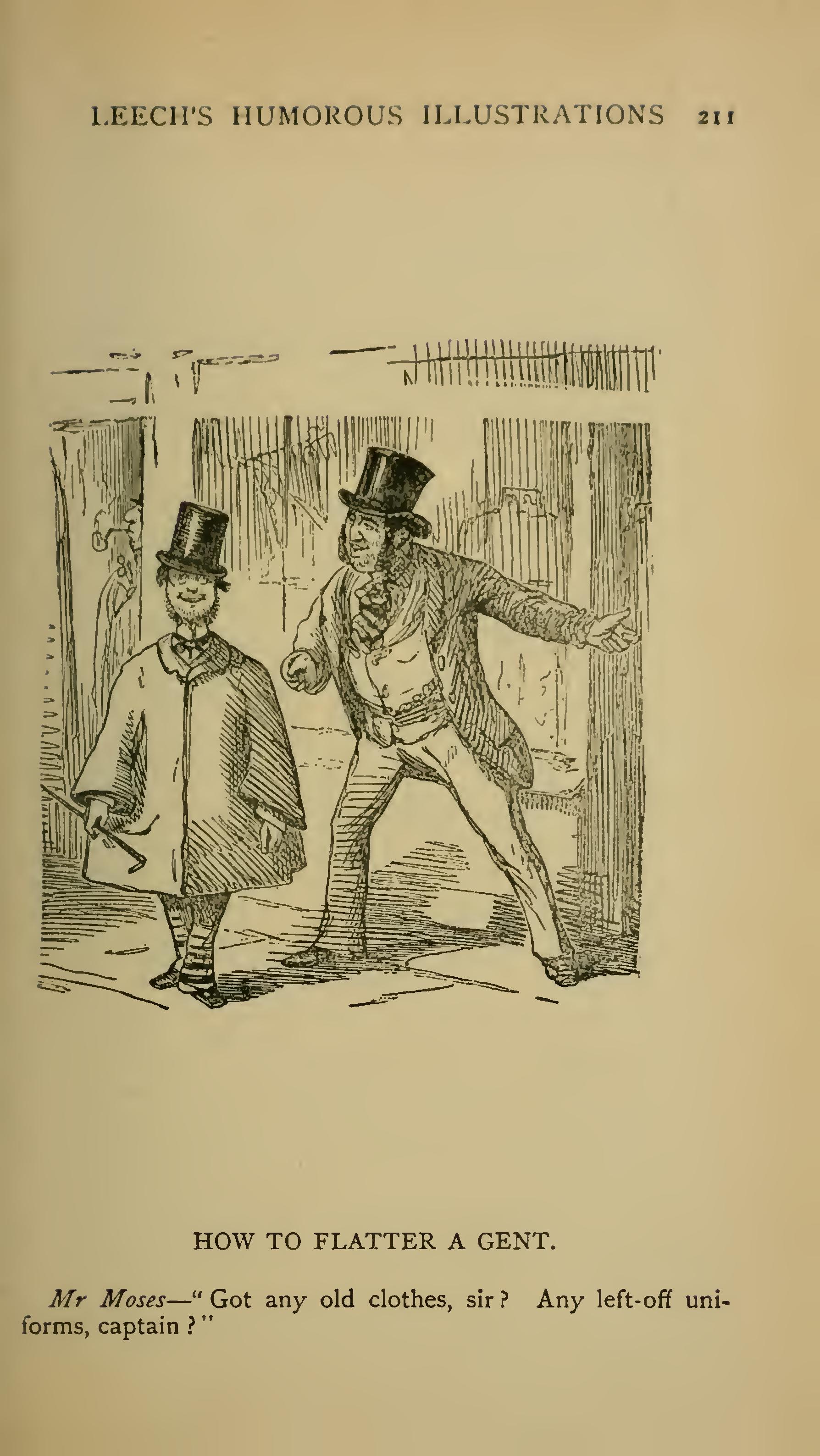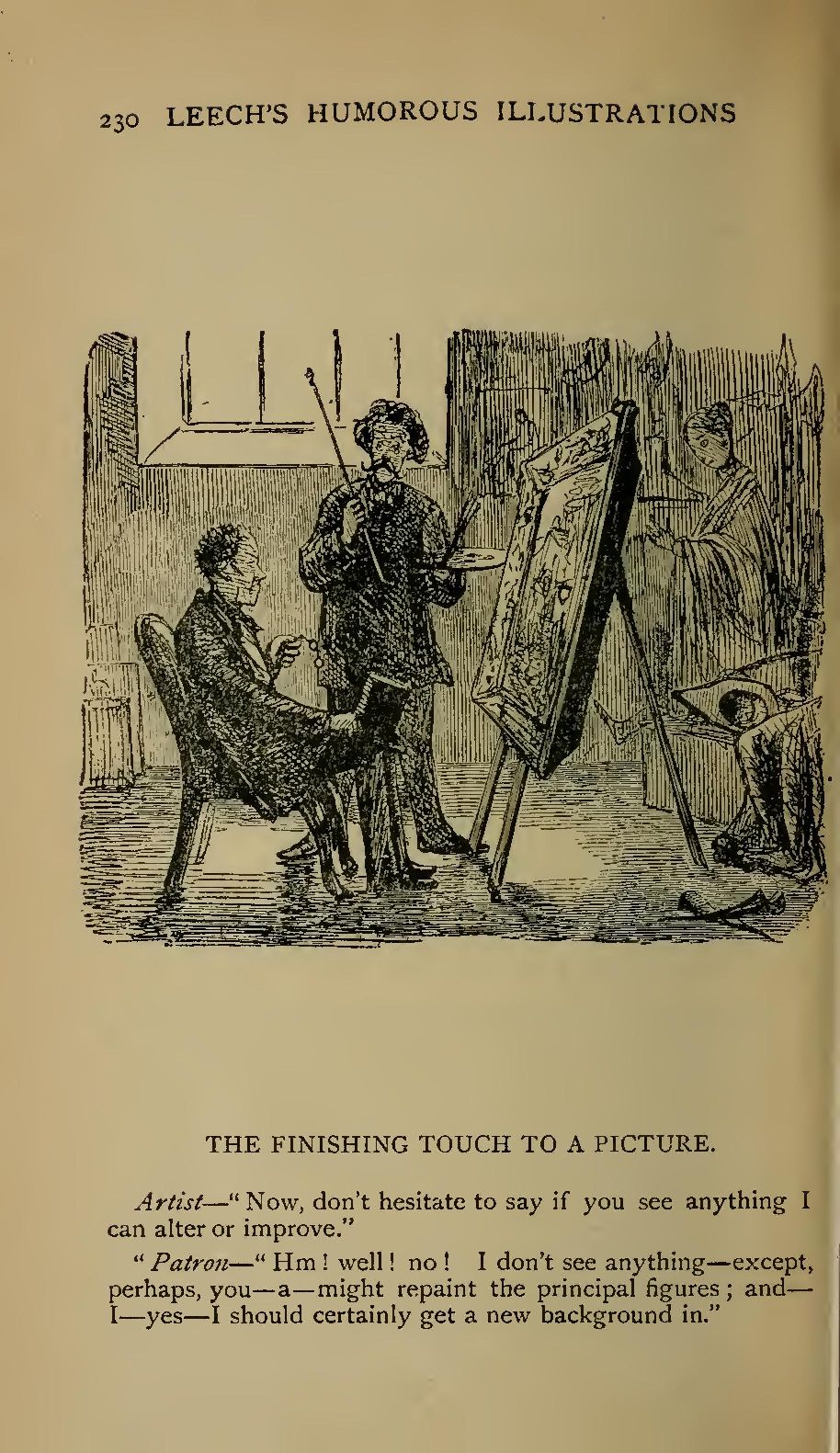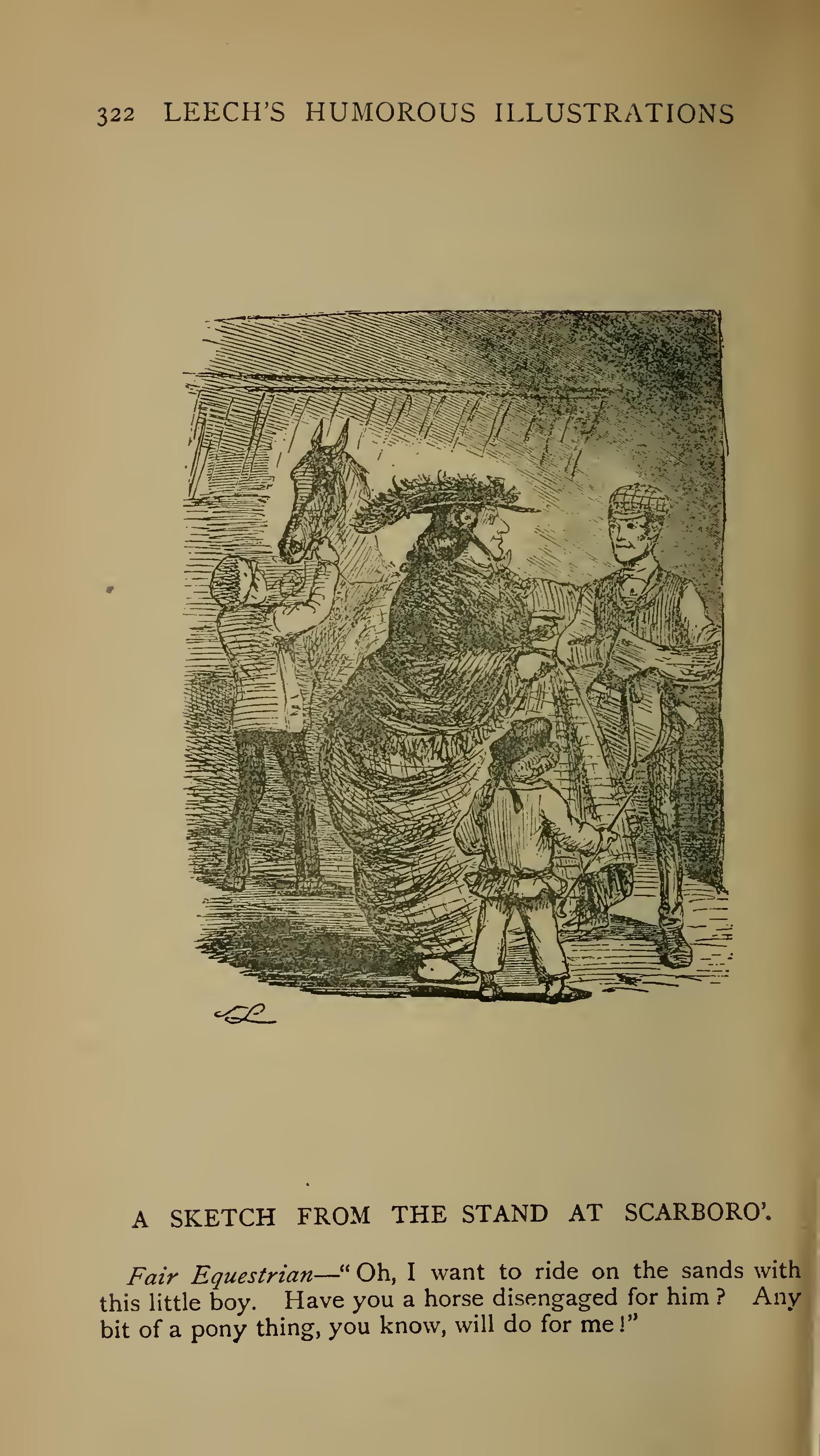 At eighteen years of age, Leech published his first work, entitled "Etchings and Sketchings by A. Pen, Esq." It was a small work of four quarto sheets. As he got more and more engrossed in artistic work, the young student seems to have gradually given up his medical studies, and to have resolved to live by his pencil. In course of time he turned his attention to lithography, and, having drawn pictures upon lithographic stones, he has been known to spend many a weary day in carrying such heavy stones from publisher to publisher in search of a buyer. But as his fame increased, the difficulty of getting remunerative employment rapidly diminished. A good deal of Leech's early work, among other things, was in connection with Bell's Life in London, the best-known sporting paper of the time. Here he was associated with Cruikshank, Madons, "Phiz," and Seymour. It was when at work for Bell's Life that he first imbibed a taste for field sports, which developed into a strong feature in his pictorial career. He joined the hounds in Herefordshire, where Millais became his fellow pupil in acquiring the arts of the chase. Among the schemes of drollery that our artist participated in about this time was the Comic Latin Grammar, Leigh contributing the text, and Leech the illustrations. This was followed by the Comic English Grammar, and likewise by the Children of the Mobility, a parody on a well-known work devoted to the serious glorification of our juvenile aristocracy.