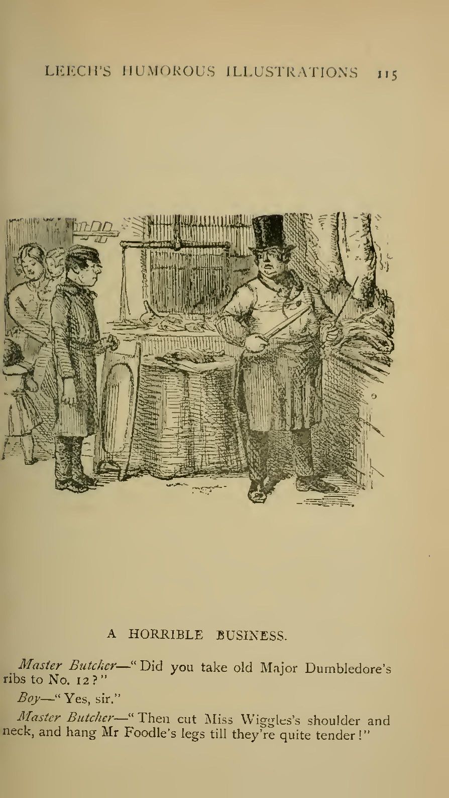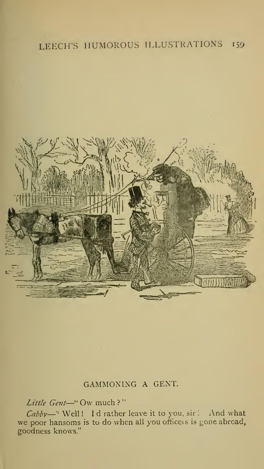 At sixteen years of age, young Leech left Charterhouse, and, notwithstanding Flaxman's advice that the boy should follow the profession of an artist, his father put him to the medical profession at St. Bartholomew's, under Mr Stanley, the surgeon of the Hospital. After a time he was placed under Mr Whittle, an eccentric practitioner at Hoxton, and subsequently under Dr John Cockle, afterwards physician to the Royal Free Hospital. Throughout his various situations, young Leech become famous among his fellow students and friends for his extremely clever—and, at the same time, always good-natured—caricatures. He was for ever drawing scenes, characters, and incidents in daily life. About this time, young Leech's liking for horses probably received its first development, through his friendship with Mr Charles Adams. Mr Adams was the owner of two horses which it was his delight to drive tandem fashion, and in his excursions Leech was his constant companion. To this circumstance we are, no doubt, partially indebted for many of the clever bits of driving and country road life depicted by the pencil of the artist. At this early period of his career, Leech made numerous life friendships with men who afterwards became distinguished. Notable among these men were Albert Smith and Percival Leigh.