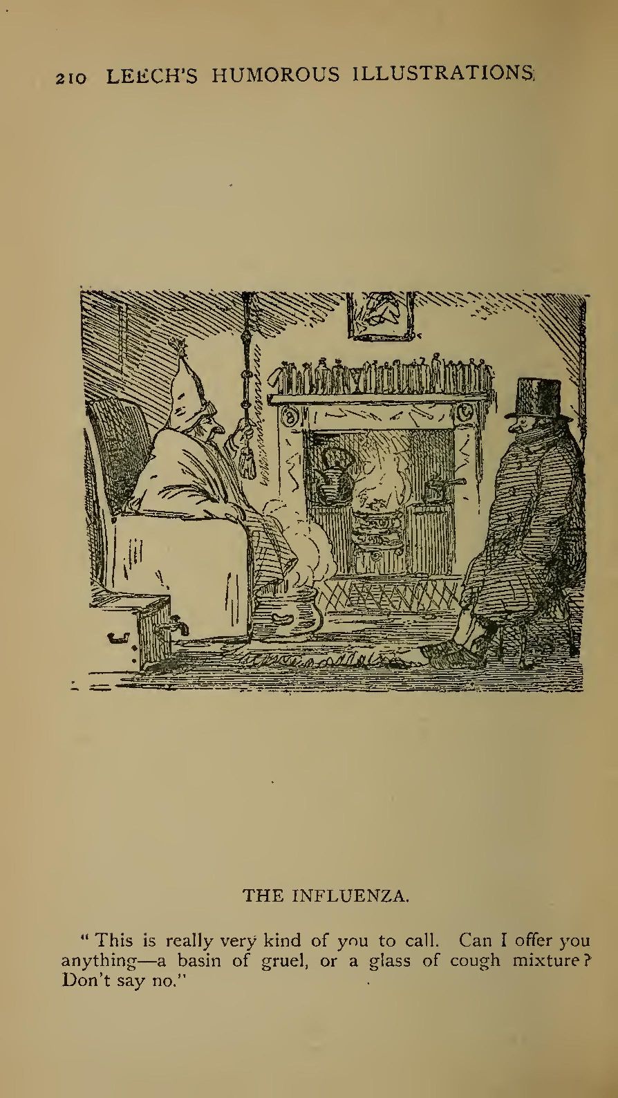 This incessant brain-work produced an extreme nervous sensitiveness. In this state he was much affected by noise and was literally driven from his house in Brunswick Square by street music. He removed to Kensington, where he hoped to obtain a release from this annoyance by adopting a device of double windows. But he had no peace. He often introduced in the pages of Punch the barrel-organ nuisance. The public, however, at that time had no idea what these sketches from real life cost the artist. In 1864, Leech was ordered to take a holiday on the Continent. Upon his return to his London home in the autumn of the same year, although better in health, he was still strangely susceptible to noise. He spoke with more than his usual earnestness about the sufferings which the street organs gave him, and about the smallness of the sympathy which he received from people who had no weakness in the same direction. This extraordinary sensitiveness to noise was only a secondary phase or symptom of the real ailment. The real malady from which he suffered was breast-pang, or spasms of the heart, a form of angina pectoris. Although it was necessary to warn Leech against all excitement, riding, quick walking, or overwork, it was not supposed that he was in immediate danger, and, if he could only find rest and quiet, great hopes were entertained of his recovery. However, the sad end came when quite unexpected. In the morning of the 29th of October, 1864, he spoke hopefully of the future to his wife. In a few hours afterwards he whispered into the same living ear—"I am going," and fell into his father's arms in a faint. Three hours afterwards he expired. The news of his death went over the country with a dismal shock; for in what house was John Leech not an inmate in one form or another?