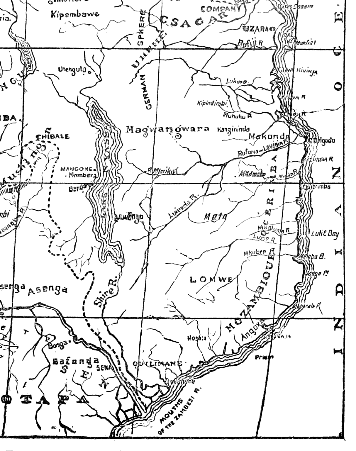 A disputed possession; the beautiful Shiré; rapids and cataracts; mountain fringed valleys; rank tropical vegetation; magnificent upland scenery; thrifty and ingenious natives; cotton and sorghum; the Go-Nakeds; beer and smoke; geese, ducks and waterfowls; Lake Shirwa; the Blantyre mission; the Manganja highlands; a village scene; native honesty; discovery of Lake Nyassa; description of the Lake; lofty mountain ranges; Livingstone’s impressions; Mazitu and Zulu; native arms, dresses and customs; slave-hunting Arabs; slave caravans; population about Nyassa; storms on the lake; the first steamer; clouds of “Kungo” flies; elephant herds; charge of an elephant bull; exciting sport; African and Asiatic elephants; the Scottish mission stations; great wealth of Nyassaland; value to commerce; the English and Portuguese claims.
