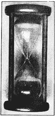 The most interesting of all water clocks is undoubtedly the “copper jars dropping water,” in Canton, China, where I saw it in 1897. Referring to the simple line sketch, which I make from memory, Fig. 8, and reading four Chinese characters downwards the translation is “Canton City.” To the left and still downwards,—“Hon-woo-et-low,” which is,—“Copper jars dropping water.” Educated Chinamen inform me that it is over 3,000 years old and had a weather vane. As they speak of it as “the clock of the street arch” this would look quite probable; since the little open building, or tower in which it stands is higher than surrounding buildings. It is, therefore, reasonably safe to state that the Chinese had a weather and time station over 1,000 years before our era. It consists of four copper jars partially built in masonry forming a stair-like structure. Commencing at the top jar each one drops into the next downward till the water reaches the solid bottom jar. In this lowest one a float, “the bamboo stick,” is placed and indicates the height of the water and thus in a rude way gives the time. It is said to be set morning and evening by dipping the water from jar 4 to jar 1, so it runs 12 hours of our time. What are the uses of jars 2 and 3, since the water simply enters them and drips out again? No information could be obtained, but I venture an explanation and hope the reader can do better, as we are all of a family and there is no jealousy. When the top jar is filled for a 12-hour run it would drip out too fast during the first six hours and too slow during the second six hours, on account of the varying “head” of water. Now, the spigot of jar 2 could be set so that it would gain water during the first six hours, and lose during the second six hours and thus equalize a little by splitting the error of jar 1 in two parts. Similarly, these two errors of jar 2 could be again split by jar 3 making four small variations in lowest jar, instead of one large error in the flow of jar 1. This could be extended to a greater number of jars, another jar making eight smaller errors, etc., etc. But I am inclined to credit our ancient Chinese inventor with the sound reasoning that a human attendant, being very fallible and limited in his capacity, would have all he could properly do to adjust four jars, and that his record would average better than it would with a greater number. Remember, this man lived thousands of years before the modern mathematician who constructed a bell-shaped vessel with a small hole in the bottom, and proportioned the varying diameter in such a manner that in emptying itself the surface of the water sank equal distances in equal times. The sand glass, Fig. 9, poetically called the “hour glass,” belongs to the water-clock class and the sand flows from one bulb into the other, but it gives no subdivisions of its period, so if you are using one running an hour it does not give you the half hour. The sand glass is still in use by chairmen, and when the oldest inhabitant gets on his feet, I always advise setting a 20-minute glass “on him.”