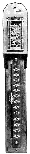Figure 18 represents a clock which is a work of art and shows great refinement of design in providing for the varying lengths of days. The bar lying across the dial is fastened to the weight through the two slits running the whole length of the dial. On this cross bar is a small pointer, which is movable by the fingers, and may be set to any one of the thirteen vertical lines. The numerous characters on the top space of dial indicate the dates on which the pointer is to be set. This clock is wound up at sunset, and it is easy to see that as the little pointer is set towards the right, the night hours at the top of the dial become shorter and the day hours longer on the lower part. The left edge of the dial gives the hours, reading downwards, and as the pointer touches any one of the curved lines the hour is read at the left-hand end. The curved lines formed of dots are the half-hours. The right-hand edge of the dial has the “twelve horary characters” which will be explained later. For dividing the varying days into six hours' sunshine it would be difficult to think of a more artistic and beautiful invention than this. It is a fine example of great ingenuity and constant trouble to operate a system which is fundamentally wrong according to our method of uniform hours at all seasons. Clocks having these curved lines for the varying lengths of days—and we shall find them on circular dials as we go on—must be made for a certain latitude, since the days vary more and more as you go farther from the equator. This will become plain when you are reminded that a Japanese clock at the equator would not need any adjustment of hour numerals, because the days and nights are equal there all the year. So after such infinite pains in forming these curved lines the clock is only good in the latitude for which it was made and must not be carried north or south! Our clocks are correct from pole to pole, but all clocks must be set to local time if they are carried east or west. As this is a rather fascinating phase of the subject it might be worth pointing out that if you go north till you have the sun up for a month in the middle of summer—and there are people living as far up as that—the Japanese system would become absurd and break down; so there is no danger of any of our polar expeditions carrying Japanese clocks.