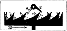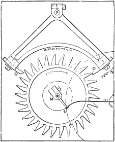 Of curious clocks there is no end, so I shall just refer to one invented by William Congreve, an Englishman, over one hundred years ago, and often coming up since as something new. A plate about 8 in. long and 4 in. wide has a long zigzag groove crosswise. This plate is pivoted at its center so either end can be tipped up a little. A ball smaller than a boy's marble will roll back and forth across this plate till it reaches the lower end, at which point it strikes a click and the mainspring of the clock tips the plate the other way and the ball comes slowly back again till it strikes the disk at the other end of the plate, etc. Every time the plate tips, the hands are moved a little just like the remontoir clock already described. Clocks of this kind are often used for deceptive purposes and those ignorant of mechanics are deceived into the belief that they see perpetual motion. The extent to which modern machine builders are indebted to the inventions of the ancient clock-maker, I think, has never been appreciated.
