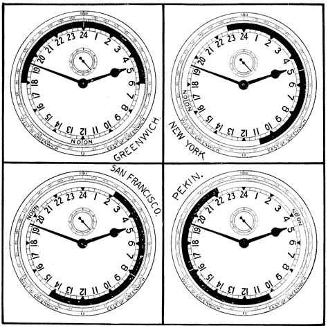 Now refer to Fig. 46, in which Greenwich is taken as universal time. The annulus, half white and half black, indicates the average day and night, and is a separate ring in the dial which can be set so that “noon” is on the meridian of the place, as shown for four places in the illustration. It is the same dial in all four cases set to local day and night. Strictly, the local time conception is dropped and the local day left for regulating working and sleeping time. All business would have the same time. In traveling east we would not have the short hours; or west, the long hours. All clocks and watches would show the same time as ship's chronometers do now. The only change would be the names of the hours for the parts of the local day. This is just the difficulty, for we are so accustomed to associate a certain number, as seven, with the morning and breakfast time. Suppose breakfast time in London is 7 o'clock, then according to the local day it would be 12 o'clock breakfast time in New York; but in both cases it would be the same time with reference to the local daylight. Let it be distinctly understood that our association of 12 o'clock with noon is not necessary. The Japanese called it “horse” and “nine”—the ancient Romans, the New Testament writers, and the Turks called it the “sixth hour”—the astronomers now call it 24 o'clock, and the Chinese represent it by several characters; but, in all cases, it is simply the middle of the day at any place. By the proposed universal time, morning, noon, and evening would be—at any given place—the same hours. There would be no necessity of establishing legal noon with exactness to the meridian, because that would only regulate labor, meals, etc., and would not touch universal time. This is an important part of the proposal and is worth elaborating a little. Sections in manufacturing districts could make their working hours correspond at pleasure and no confusion would result. That is, local working hours to convenience but by the same universal time. Note how perfectly this would work in traveling,—you arrive in Chicago from the effete east and your watch corresponds all along with the railroad clocks. As you leave the station you glance up at the clock and see that Chicago noon is 17.30, so you set the day and night ring of your watch to match the same ring on the clock, but no disturbance of the hands. As you register at the hotel you ask,—dinner? and get answer, 24.30—then breakfast, 12.30. These questions are necessary now, so I do not add complication here. When you arrive in a strange city you must ask about meals, business hours, theater hours, “doors open” hours, etc., etc.; so all this remains the same. Let us put the matter forcibly,—while we count days, or dates, something must vary with east and west; I propose the fixing of hours for business and sleep to suit each locality, but an invariable time. Get rid of the idea that a certain number, as 7 o'clock, represents the age of the day at all places. See how this would wipe out the silly proposal to “save daylight” by setting the clock back and forward. Suppose workmen commenced at 12.30 in New York; for the long summer days make it 11.30, but no change in universal time. As this is the only difference from our present time system, keep the central conception, firmly,—universal time—local day and night.