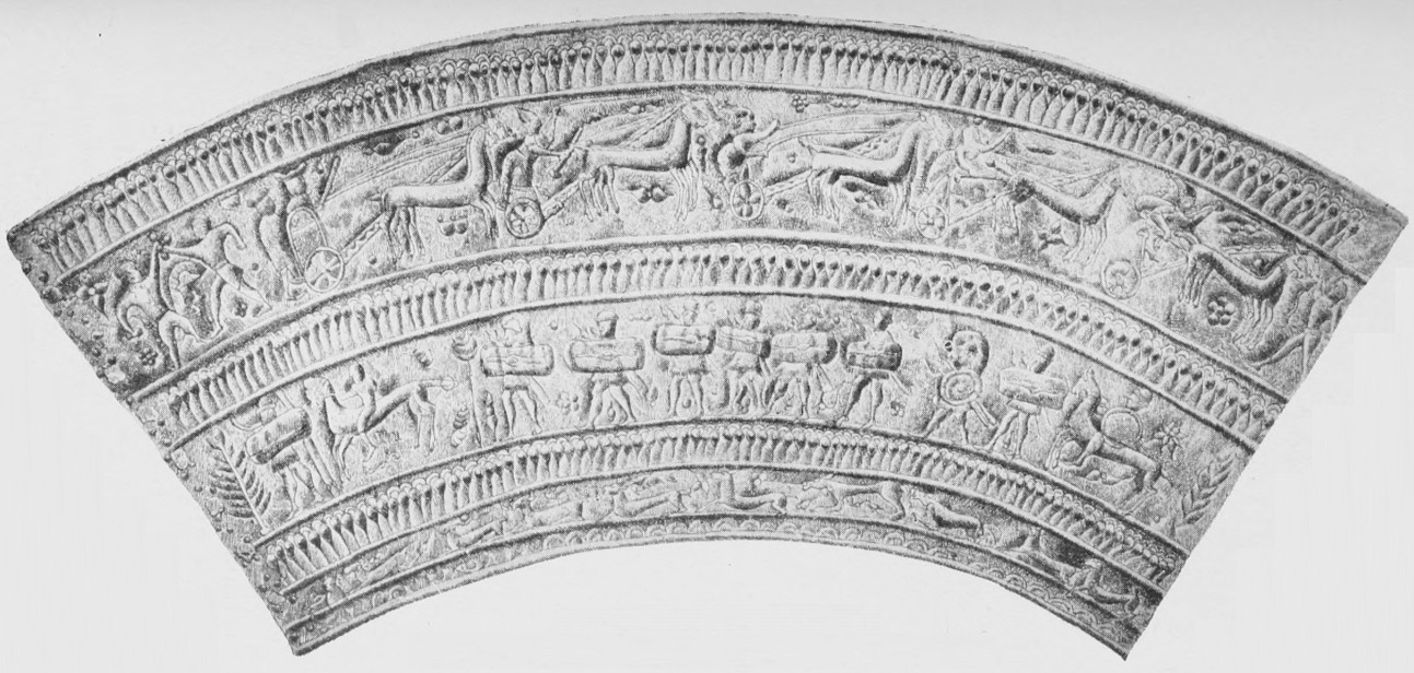 The Hallstatt civilizations betray unmistakable affinities with three other prehistoric European cultures, widely separated from one another. It contains many early Greek elements; it is very similar to a notable prehistoric culture in the Caucasus Mountains; and it resembles most nearly of all perhaps the pre-Etruscan civilization in Italy. With the third of these—the Italian—it seems to have been most nearly upon terms of equality, each borrowing from the other, after a fashion of which we shall have occasion to speak shortly. On the other hand, the relation of the Hallstatt culture to that of Greece and Caucasia seems to be somewhat more filial rather than fraternal. In describing the area of this civilization, we have seen how firmly it is intrenched all through the southern part of Austria-Hungary and well over into the north of the Balkan peninsula. A comparison of Furtwaengler's magnificent collection of objects from Olympia with those of Hallstatt instantly reveals their similarities. To make this[Pg 23] clear, we have reproduced one of the Olympian breastplates, ornamented with figures, which at once suggest those upon the situla from Watsch above described. This design is doubly interesting. It shows us a slightly higher stage of the art of figural representation, as well as of conventional design. Not only the men and horses, but the borders, are far better drawn. More than this, we begin to detect a distinctly Oriental motive in other details. The bulls and the lions—lions are not indigenous to Europe nowadays—at once remind us of their Babylonian and Assyrian prototypes. We have entered the sphere of Asiatic artistic influence, albeit very indistinctly. This design here represented, it should be said, is rather above the average of the Olympian finds of the earlier epoch. Many of the other objects, especially the little votive figures of beasts and men, are much more crude, although always characteristic and rudely artistic in many ways. Through this Olympian stage of culture we pass transitionally on to the Mycenæan, which brings us into the full bloom of the classic Greek.
