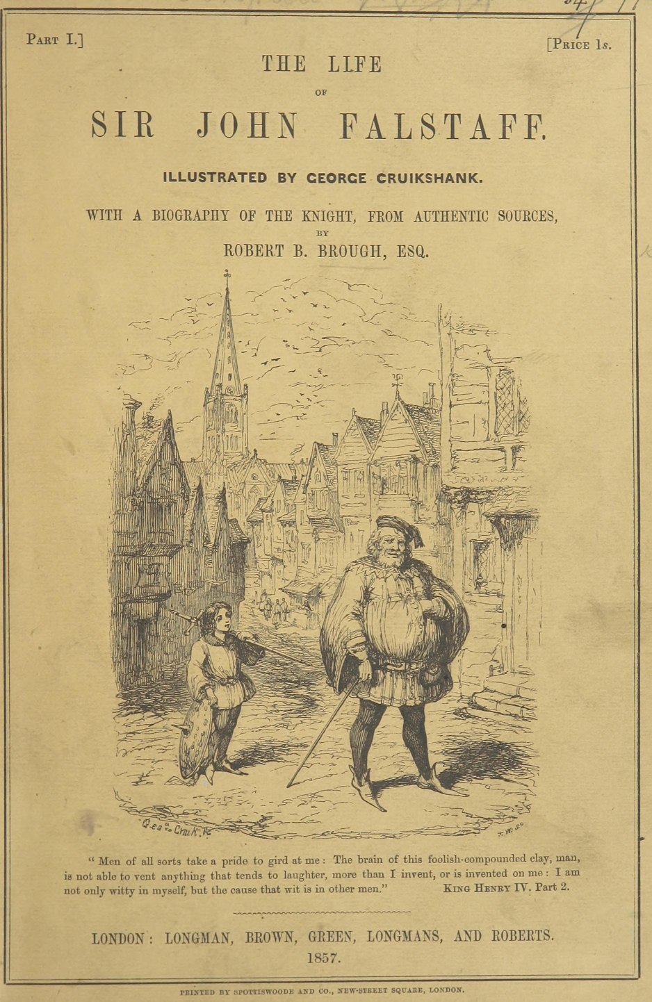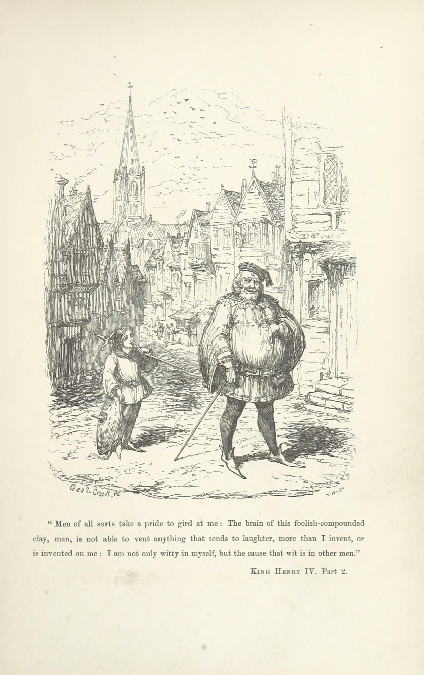 But should the Biographer recoil before this merely negative obstacle of barrenness, at the outset of his researches—as though a traveller, with his mountain goal in sight, should sit down and despair because he sees the plain beneath obscured by intervening mists? Has not the difficulty of finding a needle in a bottle of hay (which, by the way, has always appeared to us a remarkable article to be kept in bottle) been greatly exaggerated? All you have to do, is to make sure that the needle is really in the bottle. Patience and a microscope will lead you to its discovery. It may be stated that between Sir John Falstaff and a needle there is not much resemblance, and that an allusion to anything microscopic in his case is inappropriate. We merely anticipate the objection that we may pass it over. The fact that our knight lived to the age of threescore odd is a proof (by induction) that he must have been born somewhere, and at a date anticipatory by some sixty odd years of that of his death. That he had the usual number of parents is at least probable. That he had received a good education, for his time, we have ample proof. These are great data to go upon. The needle is in the bottle. All we have to do, is to separate carefully the musty hay of antiquity, aided by the glass of investigation; to plunge boldly into the mists of contradictory evidence, and push our way patiently till we get to the mountain,—which, with the full length and breadth of Mr. George Cruikshank’s faithful historical portrait on our opening page before us, is perhaps a better image than the needle.