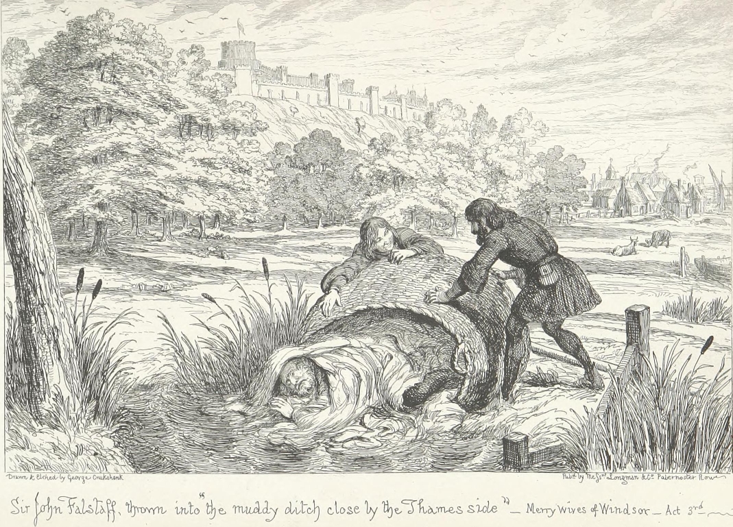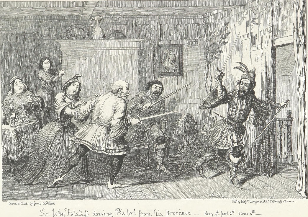 It is possible that Sir John Falstaff’s muddy boots, drenched doublet, three days’ linen and all, might have been tolerated on the score of gentle birth and past services. But there was no getting over the bodily presence of Bardolph, Pistol, and a dilapidated, draggle-tailed country justice from the wilds of Gloucestershire.