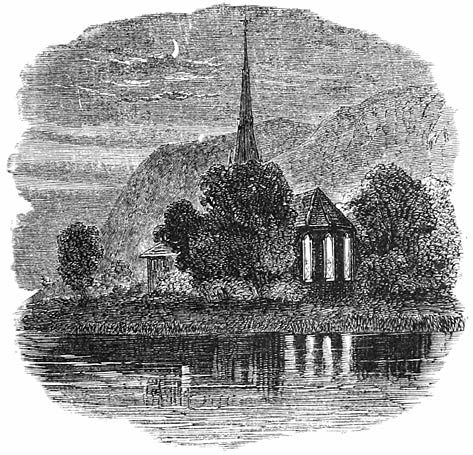 Now come the mountains, too, with their crowns of forest waving on their heads, and do homage to her beauty: [5]she gives a sweet smile to all, lingering at every turn to look back upon her friends; but yet she tarries not, her duty leads her on,—nor worldly pomp, or pride, or power, can keep her from her appointed path; she leaves them all behind, and swelling onwards through the level plain, receives the approving glance of heaven, and meets her noble husband Rhine, who, long expecting, folds her in his arms. And thus her pilgrimage complete, her duty ended, she calmly sleeps that happy sleep which wakes only in eternity.
