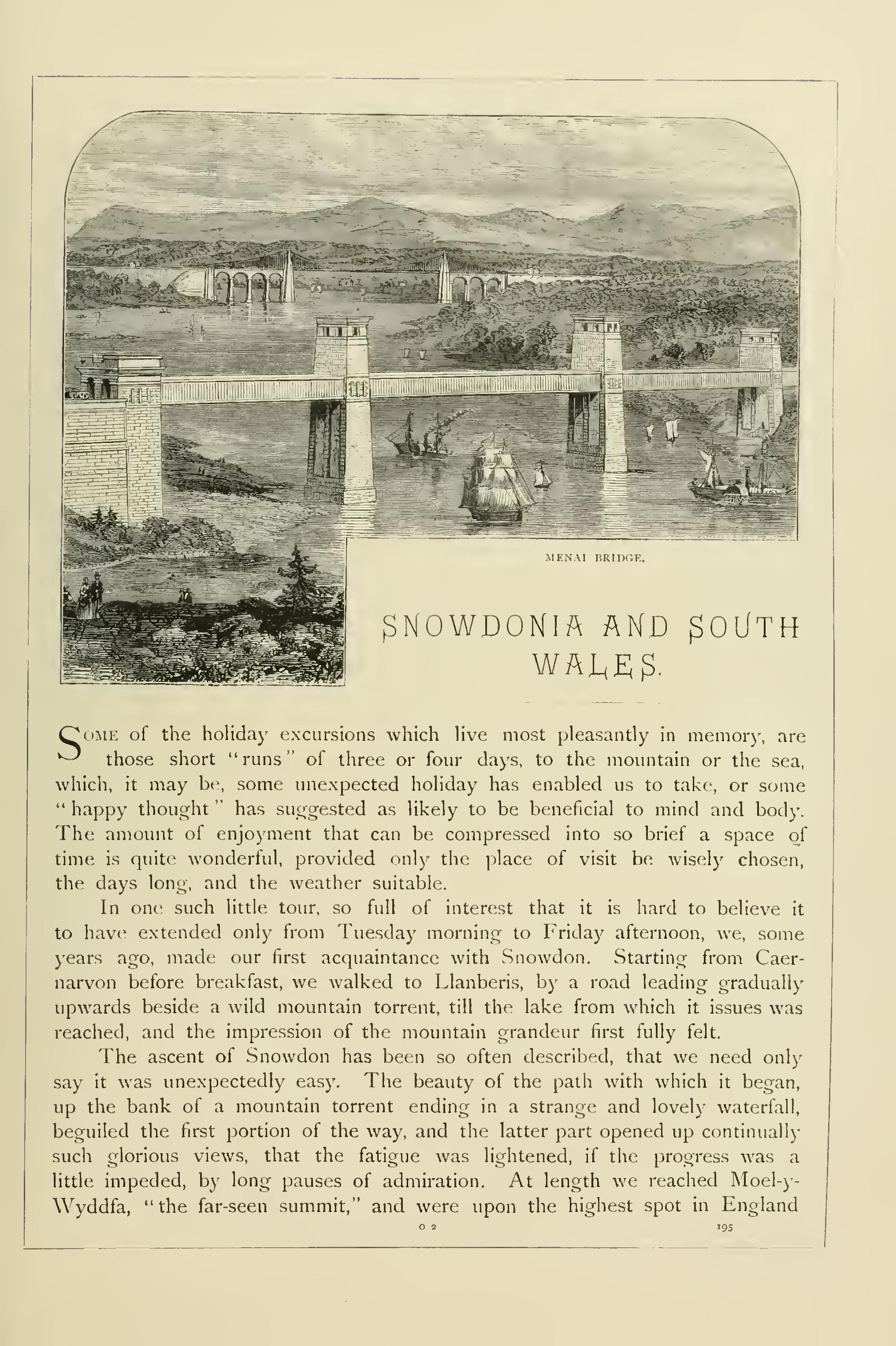 In one such little tour, so full of interest that it is hard to believe it to have extended only from Tuesday morning to Friday afternoon, we, some years ago, made our first acquaintance with Snowdon. Starting from Caernarvon before breakfast, we walked to Llanberis, by a road leading gradually upwards beside a wild mountain torrent, till the lake from which it issues was reached, and the impression of the mountain grandeur first fully felt.