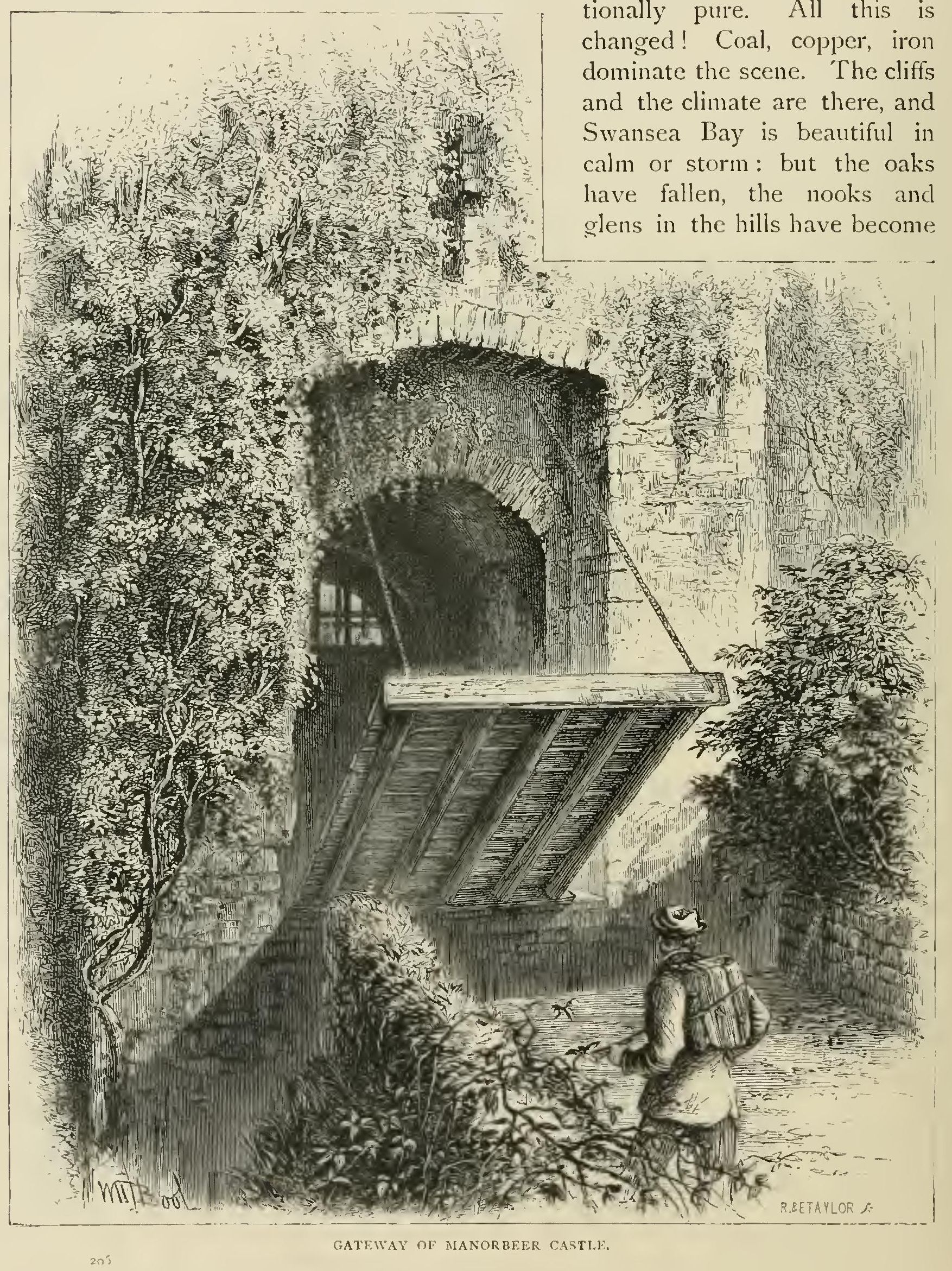 Coal, copper, iron dominate the scene. The cliffs and the climate are there, and Swansea Bay is beautiful in calm or storm: but the oaks have fallen, the nooks and elens in the hills have become squalid in their bareness, the streams are polluted, the air is murky; but the docks are admirable, and the place is "rising rapidly." There is a divineness in man's industry, as well as in nature's beauty.