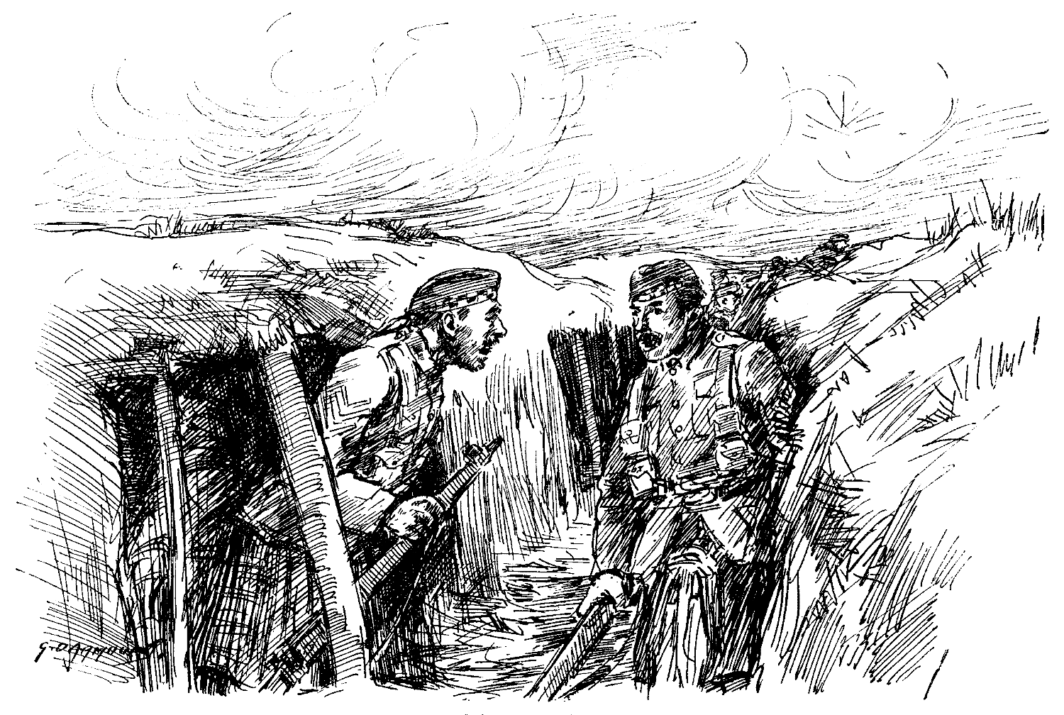 Amid the trench's sobering slosh,