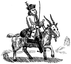 52. [Over the Chimney] The Renowned Seven Champions of Christendom, from an entire New Design. [A Capital Piece. The Seven Champions are represented in the following Manner. 1. St George is an English Sailor mounted on a Lion, with a Spit (by Way of Lance) bearing a Sirloin of Beef in one Hand, and a full Pot of Porter marked only Three Pence a Quart in the other. By the Lion’s Foot are two Scrolls, like Ballads, the one inscribed O the Roast Beef of Old England: the other, Hearts of Oak are our Men. 2. St Andrew is a Highlander mounted on a Scotch Galloway, with a Broad Sword, bearing an Oat Cake at the End of it in one Hand, and a Flask of Whisky in the other. 3. St Dennis is a Frenchman, mounted on a Deer, a timorous swift-footed Animal with a small Sword in one Hand on which a Frog appears to be spitted, and a Dish of[524] Soupe Maigre in the other. 4. St Anthony is the Pope, mounted on a Bull, with a Crosier and a Vessel of Holy Water dangling from it, in one Hand, and a Cod-Fish inscribed Food for Lent in the other. From his Right Foot hangs a Scroll inscribed Kiss my Toe, and on the Ground several Rolls of Paper, on which are written, Pardons, Indulgencies, &c. &c. 5. St James is a Spaniard mounted on a Mule with an Ingot of Gold in one Hand and a Padlock in the other. 6. St David is Taffy mounted on a Goat brandishing a Leek in one Hand, and bearing a Cheese, by Way of Target, in the other. 7. St Patrick is an Irish Soldier, mounted on a large Stone-Horse, at whose Feet is a kind of Bill with this Inscription—To cover this Season Black and All Black. He has a Sword, bearing a Potatoe on the End of it in one Hand, and a three-square Bottle, inscribed Green Usquebaugh in the other.]