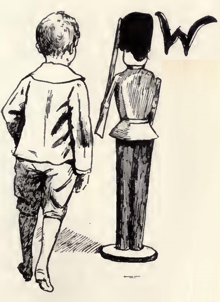 The Wooden Soldier, who had a label round his neck with “One-and-Nine” written on it, turned stiffly around, so that he faced Boy, and said in a deep voice,—