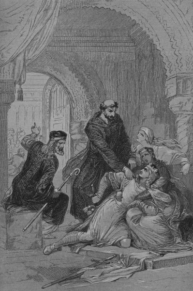 The solemn Sabbath day that dawned upon that battle-ground saw the Norman Conqueror encamped amidst the living and the dead. And when he called over the muster-roll which had been prepared before he left the opposite coast, many a knight, who on the day when he sailed, had proudly answered to his name, was then numbered with the dead. The land which he had done homage for was useless to him then. He had perilled his life, and a few feet of common earth was all the reward that death allotted to him. The conqueror had lost nearly a fourth of his army—a number, from all we can gather, equal to the whole of the Saxon force engaged in the field. Those who survived received for their share of the victory the spoils of the slaughtered Saxons. The dead body of Harold is said to have laid long upon the field before any one ventured to claim it, but at length his mother, the widow of Earl Godwin, ventured forth, and craved permission to bury it. It is said that she offered to give the Norman duke the weight of his body in gold, but that he sternly refused to grant her request; and, in his savage triumph, exclaimed, "He shall have no other sepulchre than the sand upon the sea-shore." He, however, relented at338 last, says Thierry, "if we are to believe an old tradition, in favour of the monks of Waltham abbey, which Harold had founded and enriched. Two Saxon monks, Osgod and Ailrik, deputed by the abbot of Waltham, demanded and obtained permission to transport the remains of their benefactor to their church. They sought among the mass of slain, despoiled of arms and clothes, examining them carefully one after the other, but could not recognise the body of him they sought, so much had his wounds disfigured him. Despairing ever to succeed in their research unaided, they addressed themselves to a woman whom Harold, before he became king, had kept as a mistress, and intreated her to assist them. She was called Edith, and surnamed the Beauty with the Swan's Neck. She consented to accompany the two monks, and was more successful than they in discovering the corpse of him whom she loved."