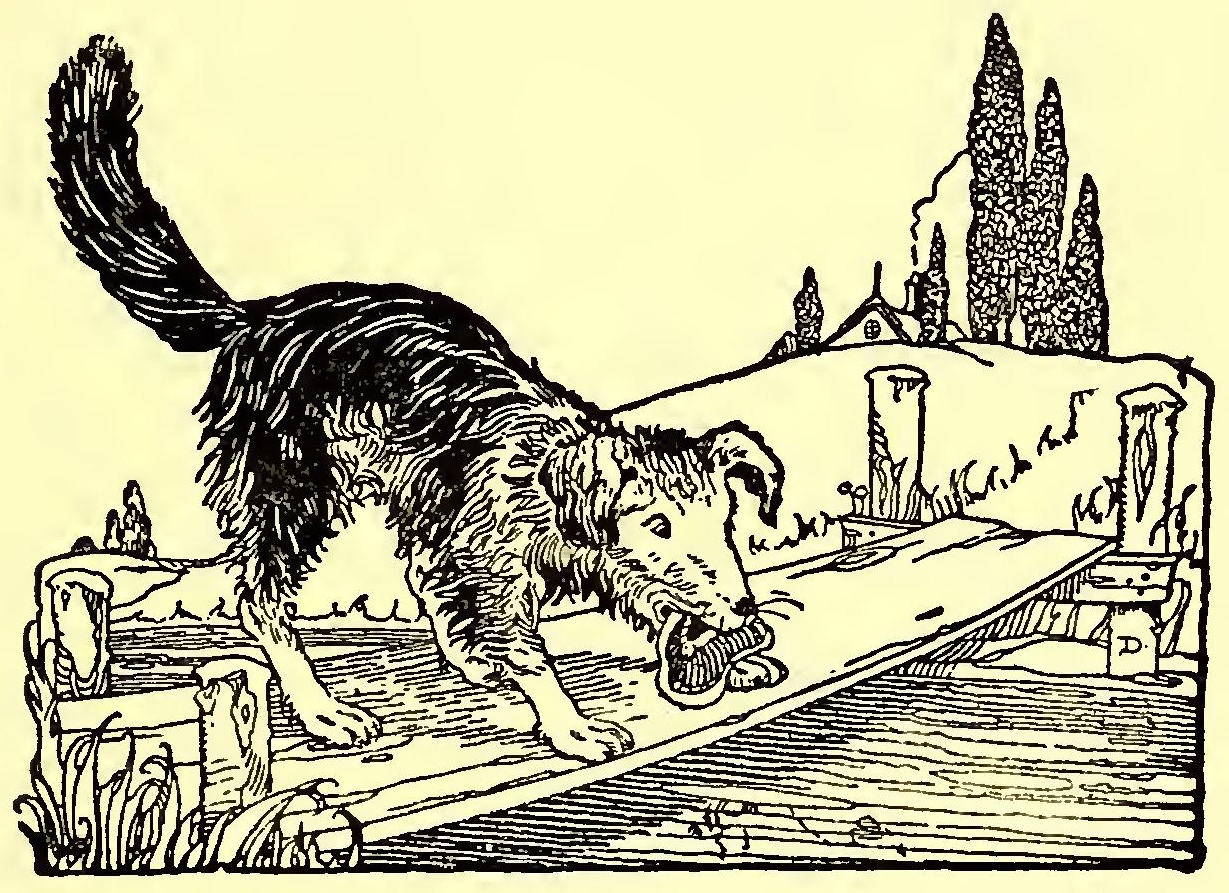 He held the candle close, to light it, but the Cat, not liking the joke, sprang at his face, and spit, and scratched him. Away he ran to the door. But there the Dog jumped up and bit him in the leg. As he was crossing the yard, the Ass kicked him, and the Cock, now awake, crowed with all his might.