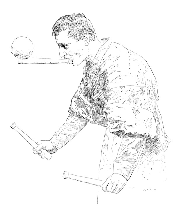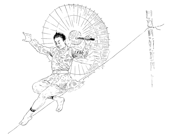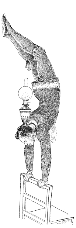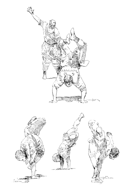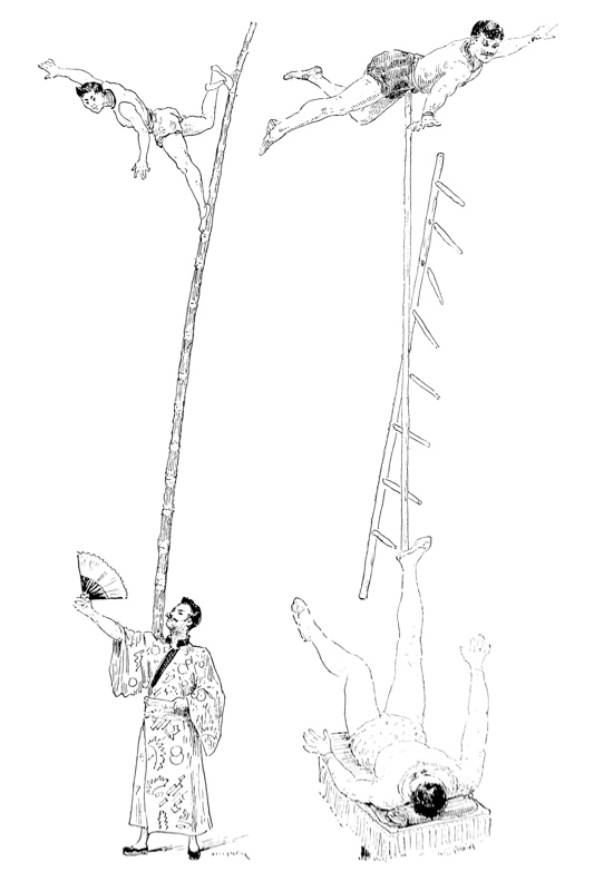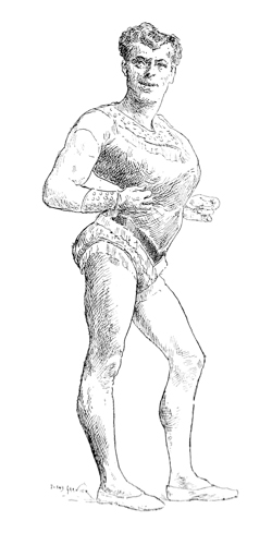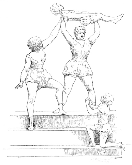 Qualities transmitted through many generations, natural selection always tending in the same direction—of strength and dexterity—have, in course of time, endowed this [p003] international people with special characteristics. With regard to the superior instincts, they possess a taste for adventure, wonderful facility in acquiring languages, in assimilating every variety of civilization, and a strange amalgamation of qualities, which would seem incompatible with each other—Italian pliancy, Anglo-Saxon coolness, German tenacity. I do not quote the influence of French characteristics in the fabrication of these free citizens of the world: the soil of France is so dear to her children that, even if they tempt the glory and perils of an acrobat’s life, they rarely leave their native land. According to statistics, Frenchmen form a proportion of but five per cent, in the tribe of banquistes who travel round the world. But these mountebanks are not so numerous as one might imagine; in all there are only a few thousands. But earth contains no guests more free than these men, whom the poet Theodore de Banville greets as the “brothers of the birds, the inhabitants of the ideal city of Aristophanes.” Lords of their own will and time, they obey no laws except the terms of their voluntary engagements. They fly from war, pestilence, and ruin. When the heavens darken, they strap up their trunks, go on board a steamer and journey to other countries where gaiety and gold are to be found.