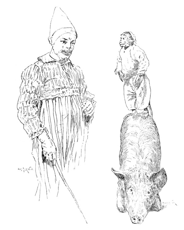 This publication is really the monograph of an unknown people, related by the pen and pencil. Its laws, its customs, its traditions, its secrets, its hopes, have been seized, defined in spite of reticence, evasions, wavering, and contradictory witnesses. It describes the organization of the banquiste people, the foundation of its agencies, newspapers, and syndicates, it follows the mountebank from his birth in the wandering caravan to his apotheosis in the friezes of the circus. And at the same time it penetrates into the stables to explain the secrets of the trainer, the tamer, and the ring-master; into the booths to ask the clown for the story of his adventures—and by what chance, having become a gentleman himself, he one day met in the land of whims a gentleman who had become a clown!