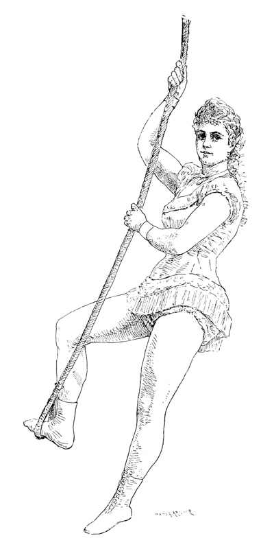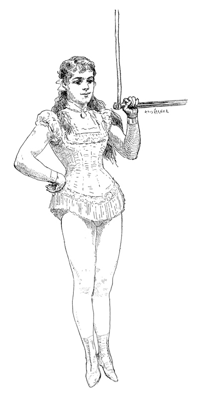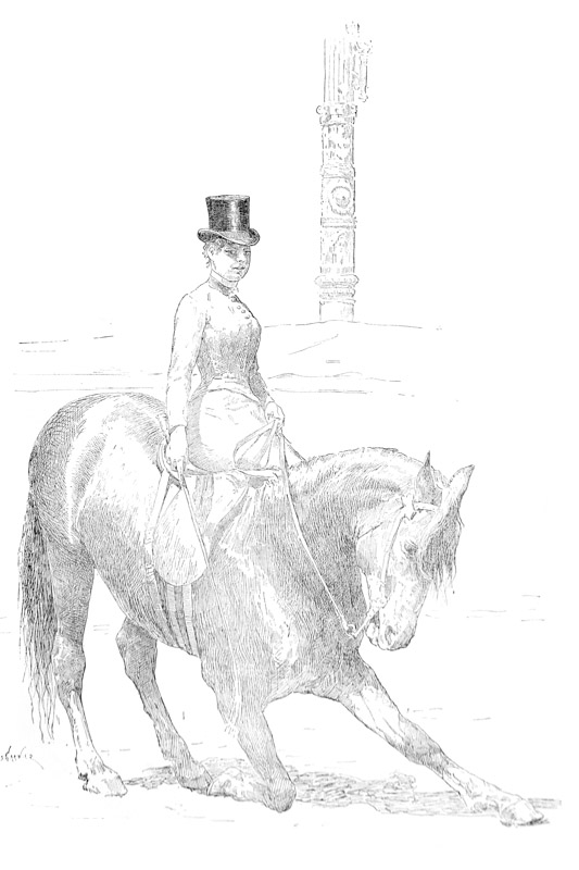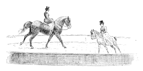 Nor since Jenny O’Brien left us for America have we ever seen a woman ride standing upon two horses with as much dainty jauntiness, self-possession and audacity as Miss Anna. And then how well she dresses! Lovers of Florentine bronzes will never forget a certain suit of grey tights, a harlequin’s [p324] costume, cut low and heart shaped at the neck, with greaves of the same grey tint below the knees.