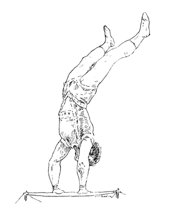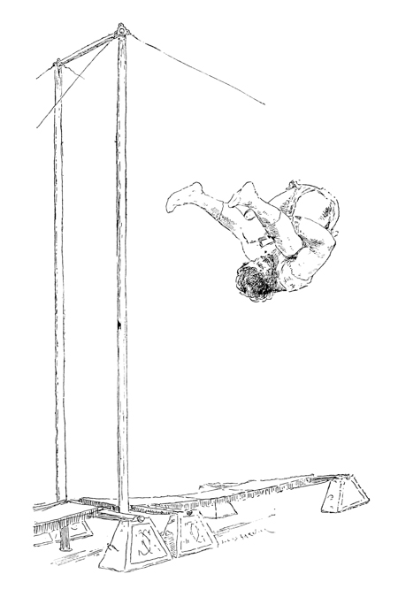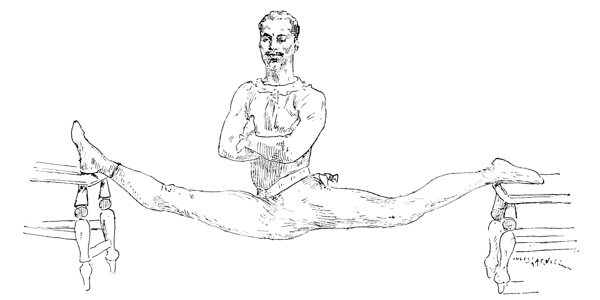 In the month of June, 1888, M. Houcke having given us an appointment at the Hippodrome, made the clown, Auguste, and an artist of the fixed bar, vault in our presence. The members of the Société d’Excursions Française de Photographie, headed by its president, were nearly all assembled. Fifty cameras were arranged like a battery: each amateur had brought twelve glasses. After they had been examined, M. Albert Londe sent us ten proofs, which alone out of six hundred had been deemed worthy of being printed, and after a final examination only seven plates were preserved by the painter. They inspired the series of somersaults which are found in the chapter on GYMNASTS.